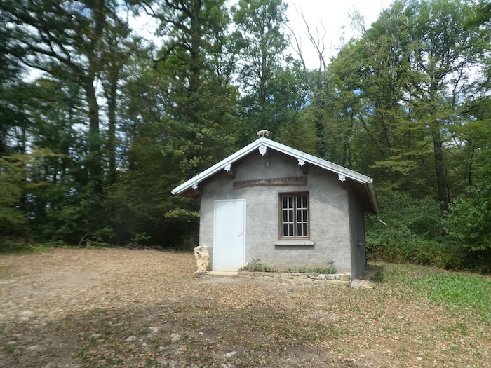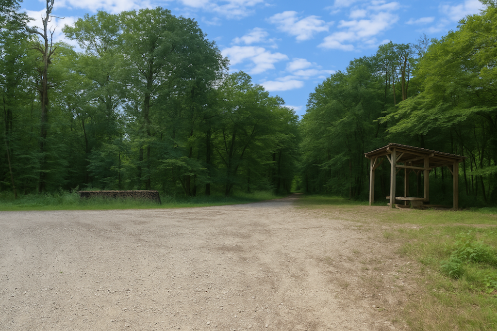 | Au terme de cette rectitude, le chemin s’ouvre sur une petite clairière accueillante, un havre de paix où un abri rustique et une table de pique-nique invitent à la halte et à la contemplation. |