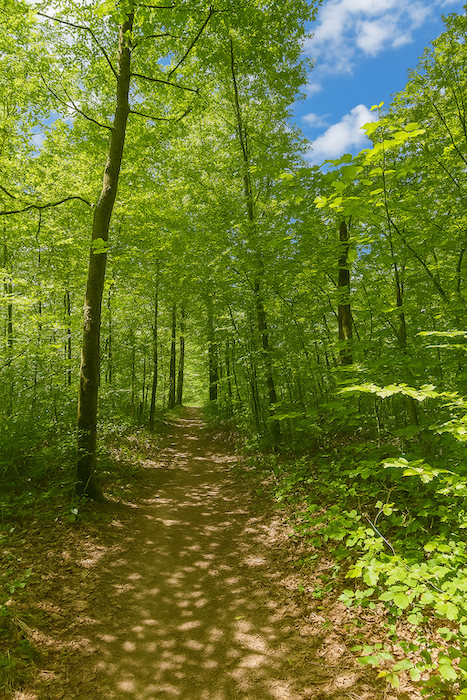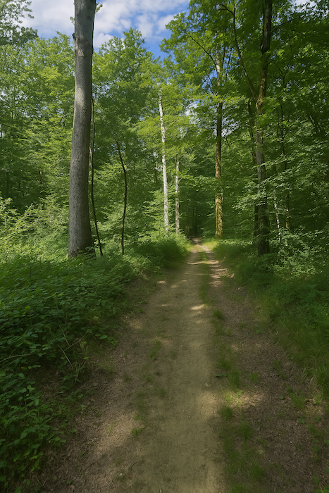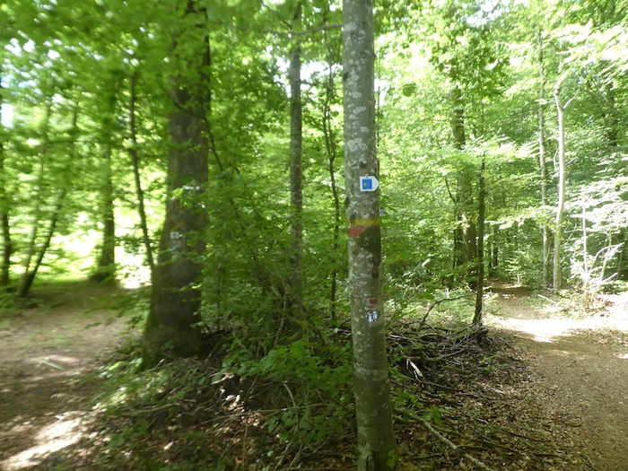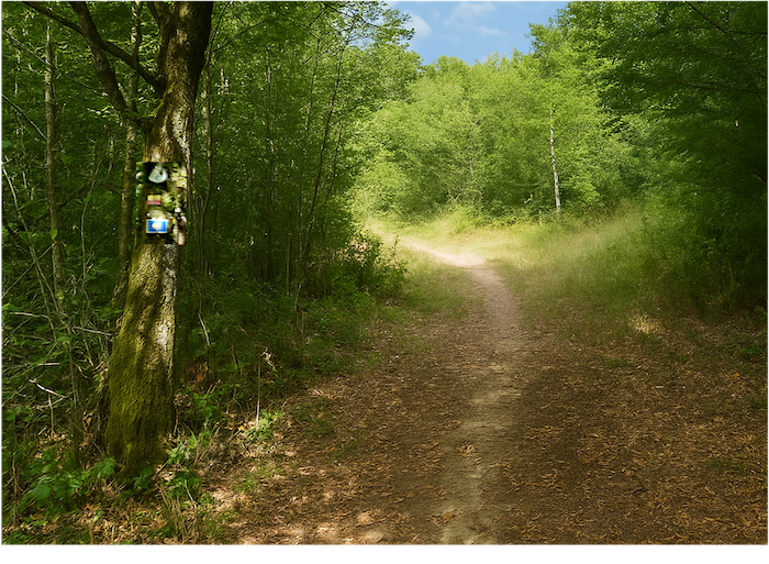 | Bientôt, le chemin s’élève en une pente assez soutenue, grimpant parmi les hauts feuillus où la lumière danse à travers les feuilles. Ici, le bois s’ouvre, n’est pas dense, et laisse à la fois respirer l’espace. |