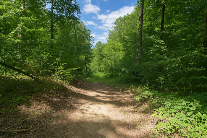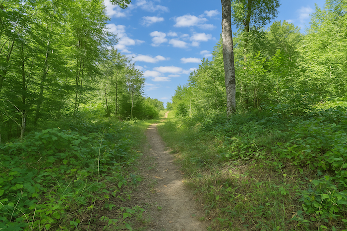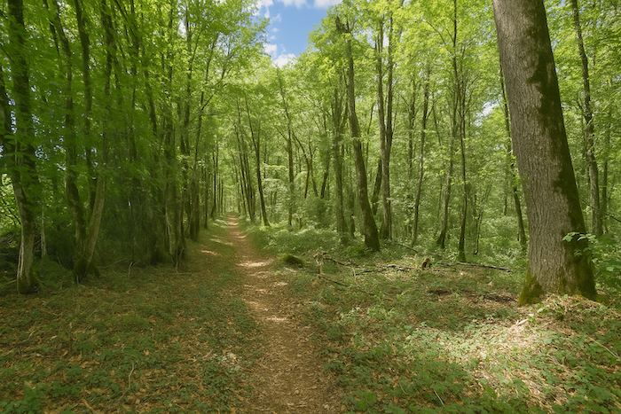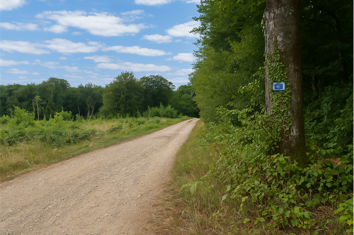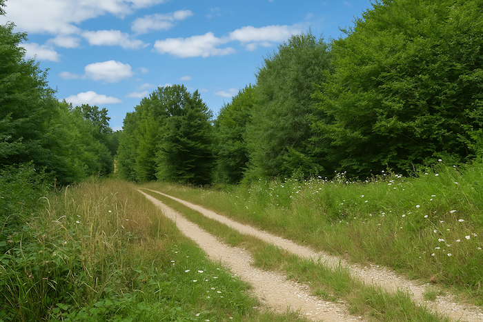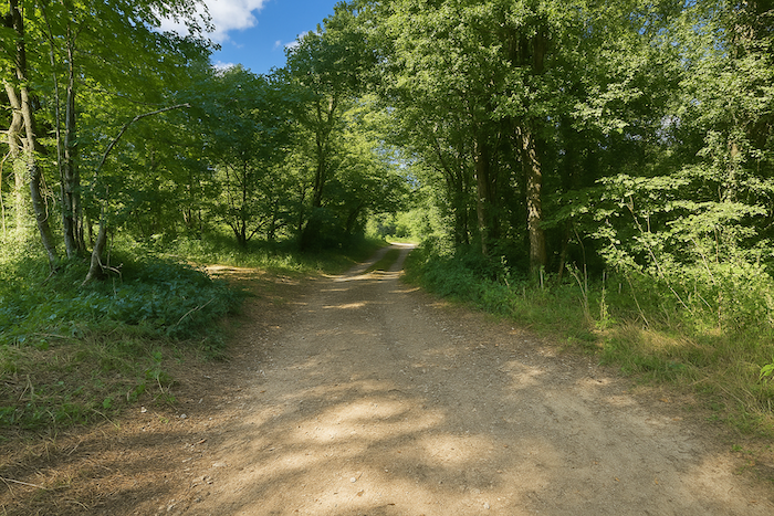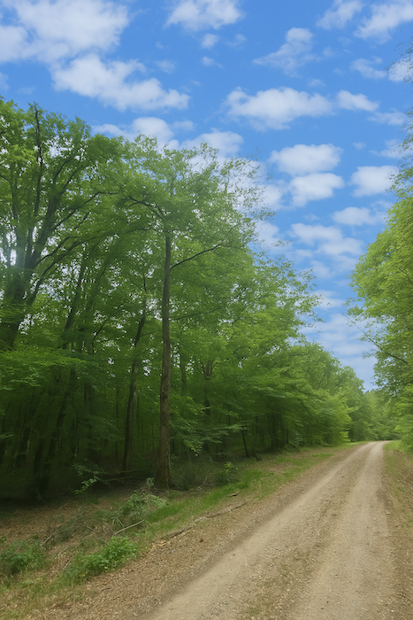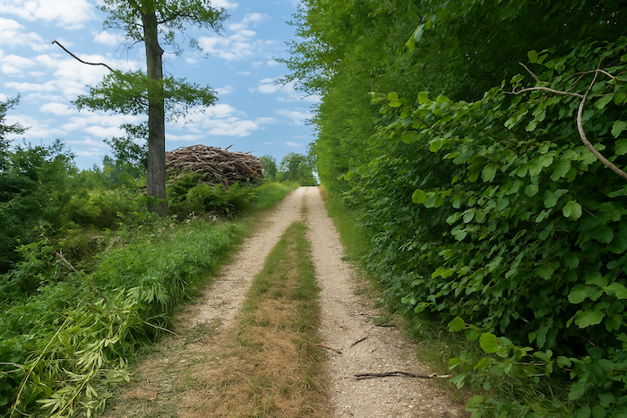 | Bientôt, les grands feuillus reprennent leur règne majestueux, dominant le chemin qui s’étire alors en une longue ligne droite. Ici, la forêt se fait travailleuse : le bois est exploité avec respect, témoignant d’un équilibre fragile entre l’homme et l’arbre. |