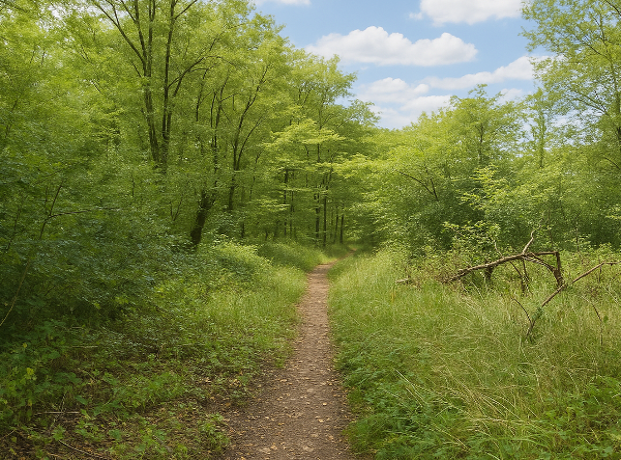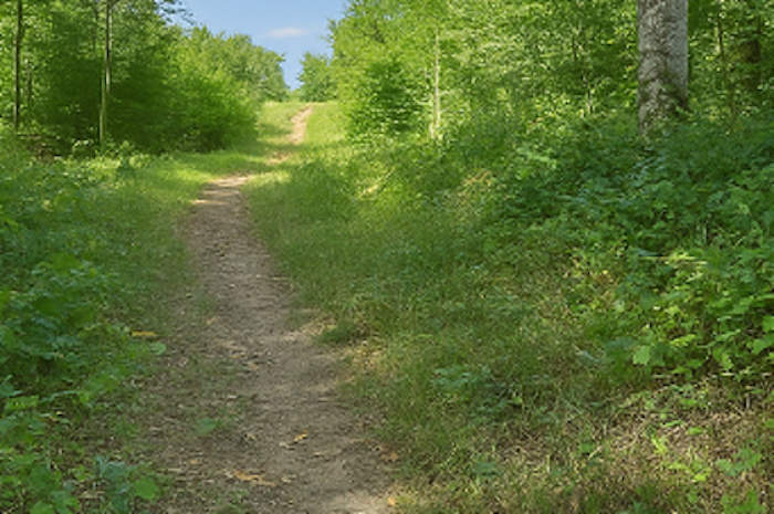 | Le chemin poursuit son ascension vers le sommet de la colline, comme un souffle continu qui porte le marcheur toujours plus haut, vers des horizons secrets. En saison, la nature se révèle généreuse et nourricière : des buissons chargés de mûres sauvages offrent un festin sucré, presque miraculeux. Ici, la forêt murmure qu’on pourrait survivre, presque à l’écart du monde, bercé par l’abondance simple et sauvage. |
