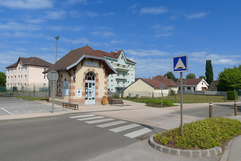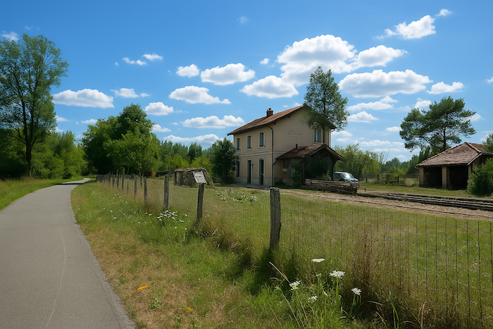 | La route longe alors l’ancienne gare de Dampierre, vestige silencieux perdu au cœur d’une nature qui reprend peu à peu ses droits, mêlant ruines et herbes folles dans une étrange mélancolie. |
