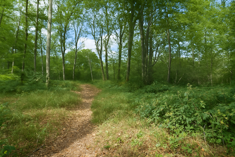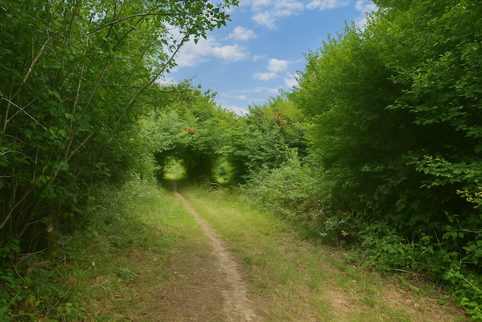 | Plus loin, la grandeur des arbres se fait plus humble, comme si la forêt s’effaçait en douceur, pour laisser place à un passage intime, presque secret. Le chemin se glisse alors sous des voûtes de verdure, où les rejets graciles des hêtres s’entrelacent avec les charmilles, telles des arabesques délicates dessinées par la nature, comme si l’on avait pénétré dans un royaume discret, réservé aux initiés. |