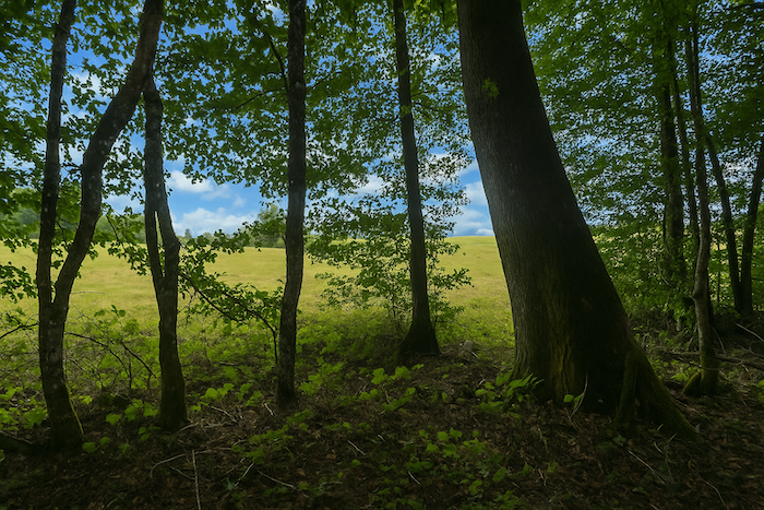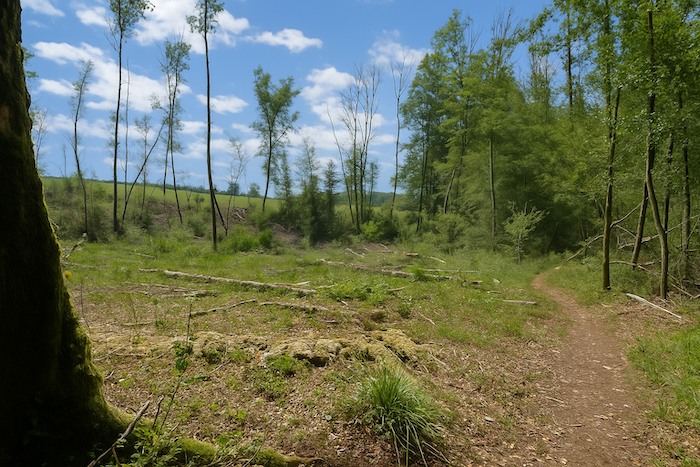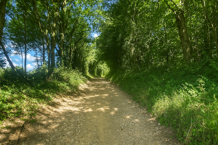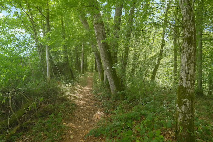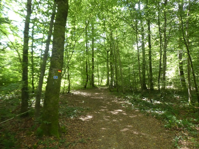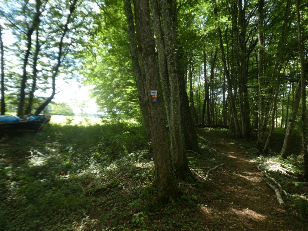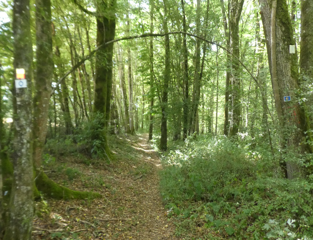 | Le chemin alors ondule avec grâce dans le sous-bois le long des prairies. |
