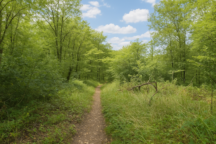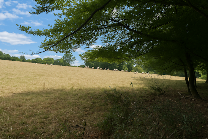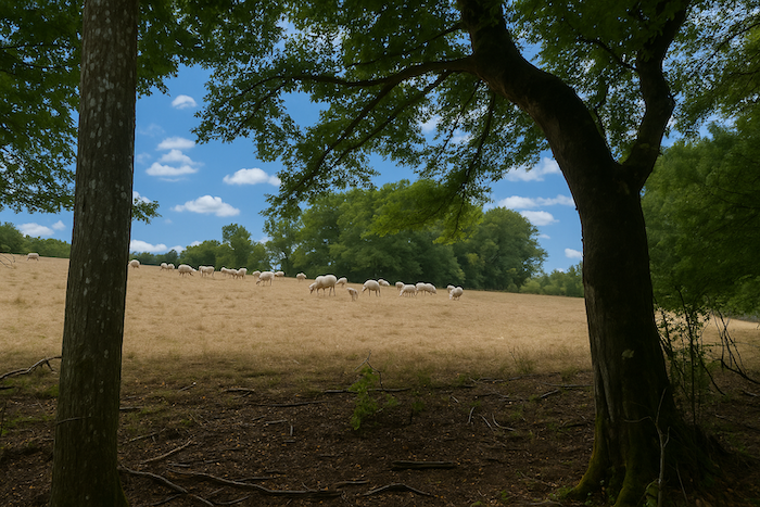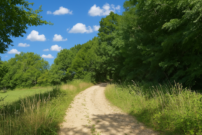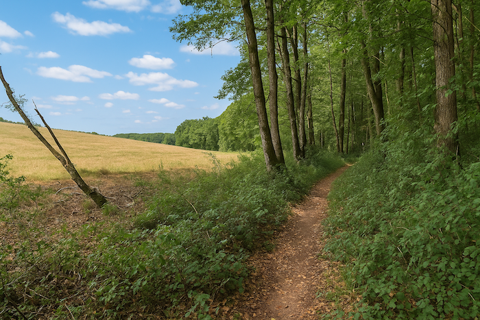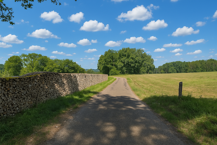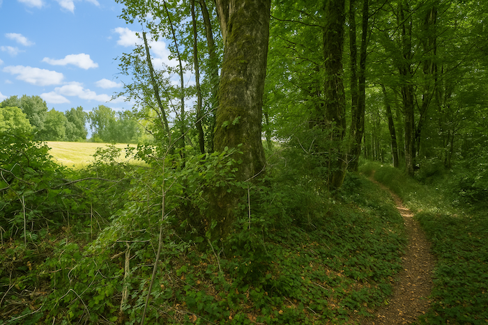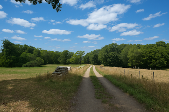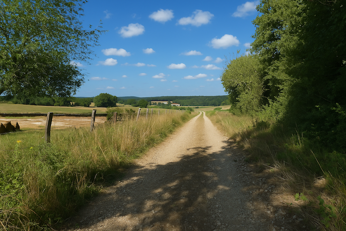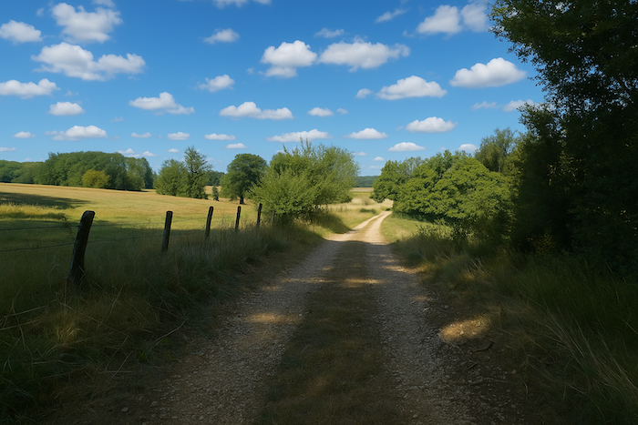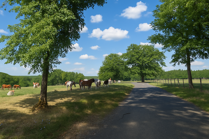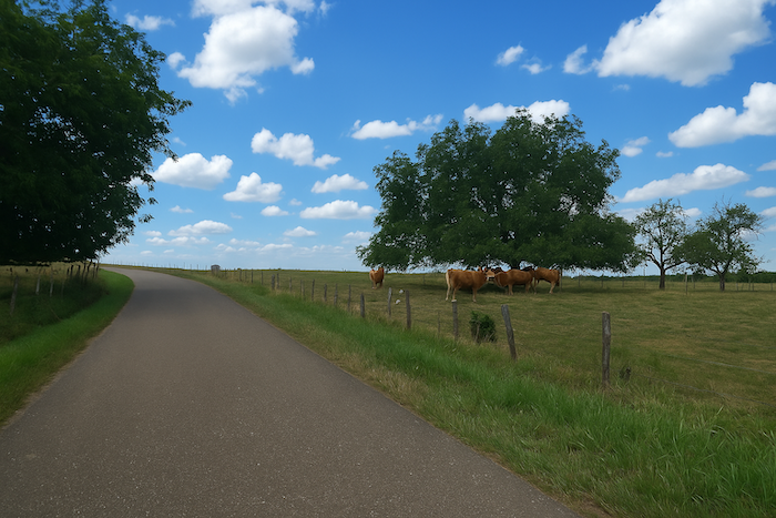 | Puis, le chemin s’étire longuement à l’orée du bois, comme s’il hésitait entre l’ombre protectrice des arbres et la clarté des prairies. Ici, des Charolaises, paisibles et robustes, paissent tranquillement, animant le paysage d’une vie douce et rassurante, comme une présence silencieuse et familière au cœur de cette nature ouverte. |