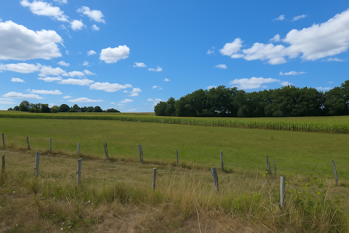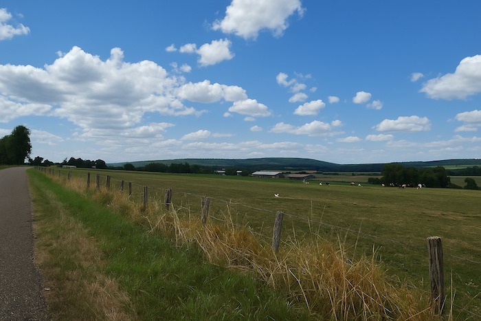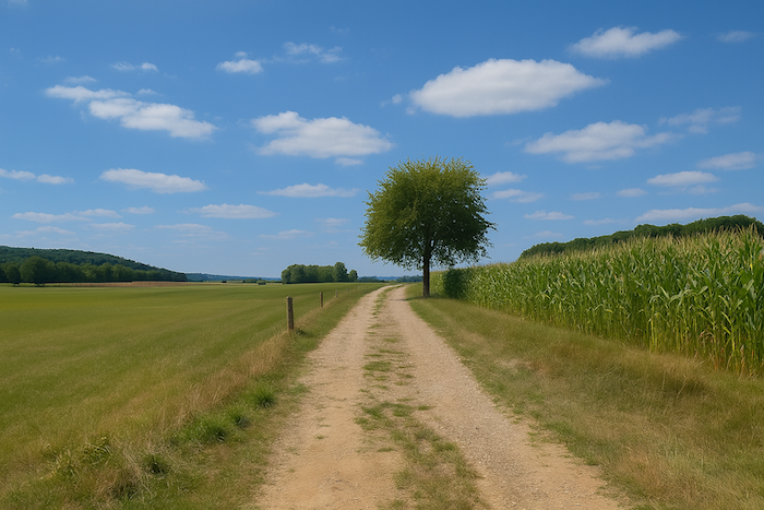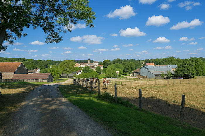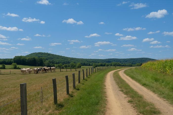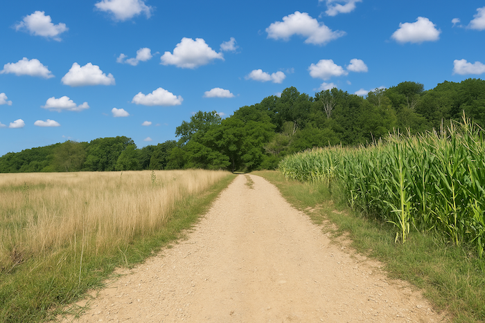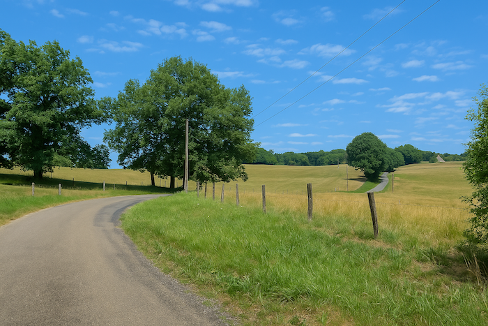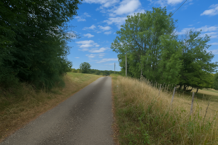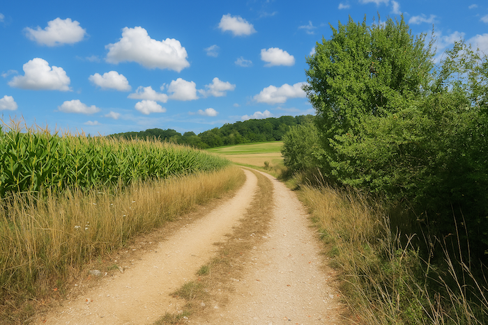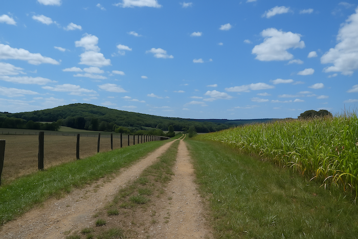 | Il s’étire entre les prés et les rangées serrées de maïs, comme une invitation à renouer avec la nature et la simplicité. |