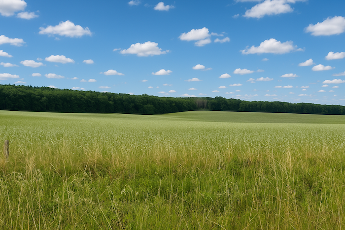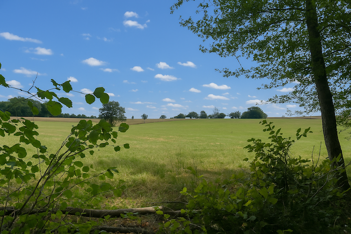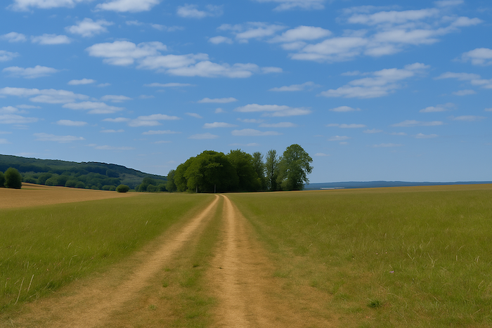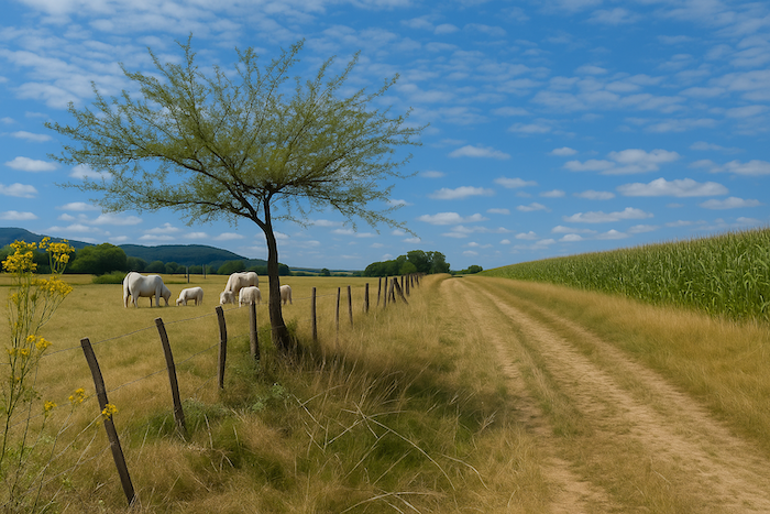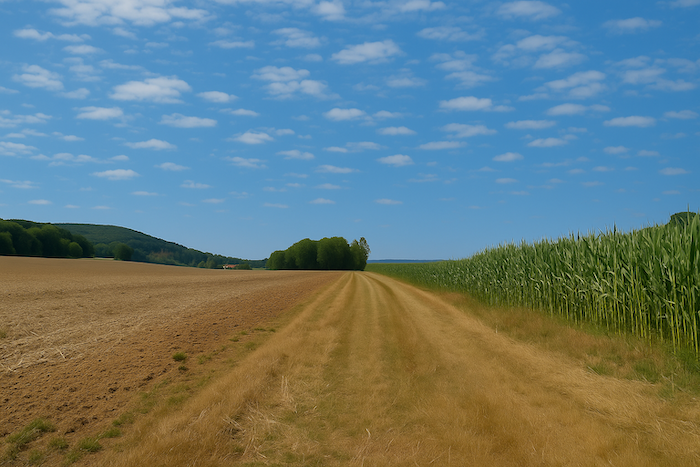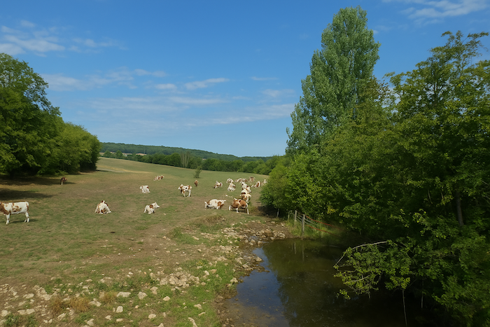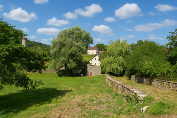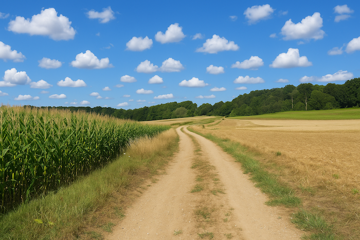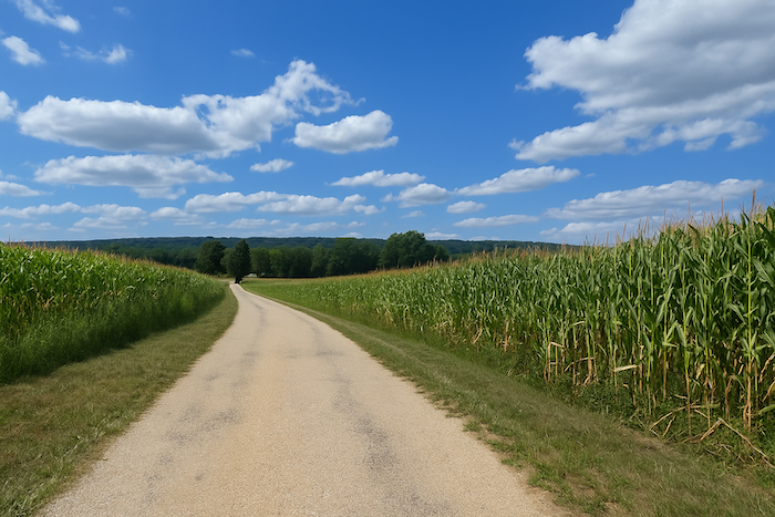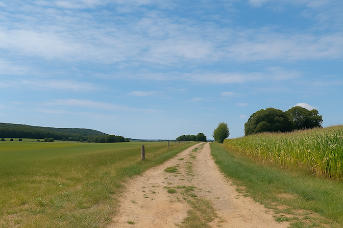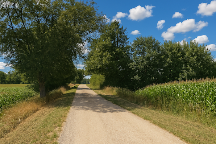 | Il s’étire entre les prés et les rangées serrées de maïs, comme une invitation à renouer avec la nature et la simplicité. |