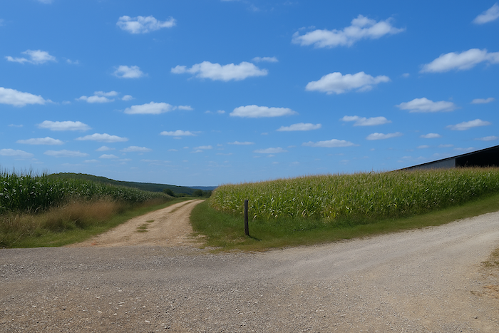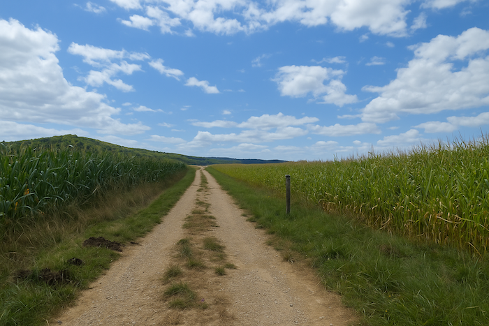 | Bientôt, le parcours quitte l’asphalte pour tourner à droite, s’engageant sur une piste de terre battue qui se perd entre les rangées de maïs, une mer verte et ondulante où la nature reprend ses droits dans une danse millénaire. |