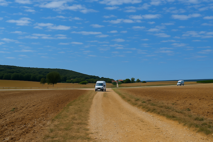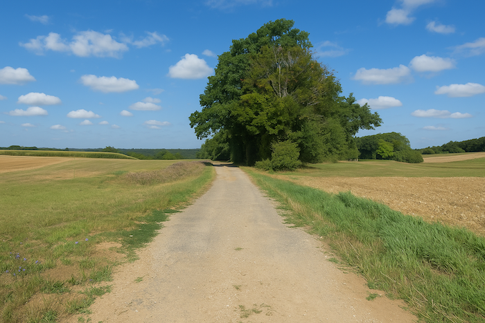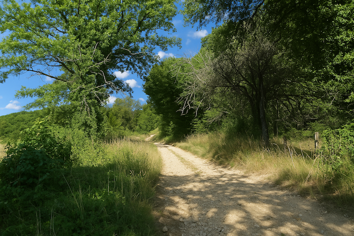 | Au début, l’ombre fraîche des grands feuillus vous enveloppe encore, offrant un refuge contre la lumière brûlante, mais, plus loin, la piste s’étire vers l’horizon, dévoilant un paysage plus dépouillé, plus nu, où le regard se perd dans l’infini. |