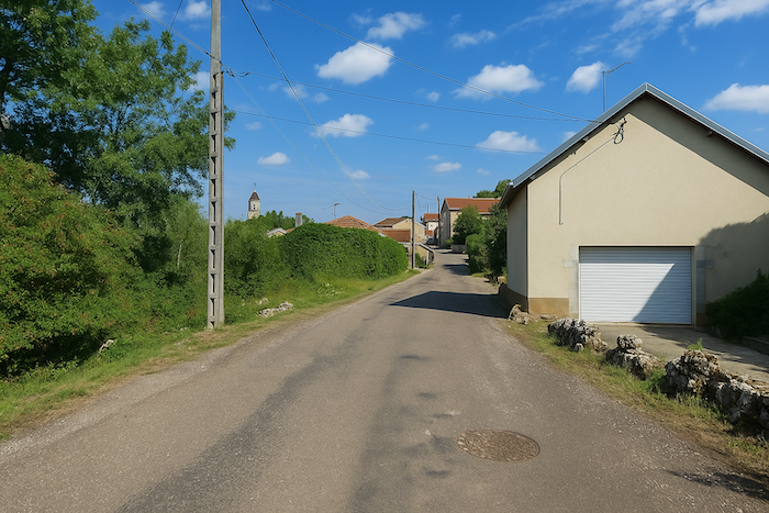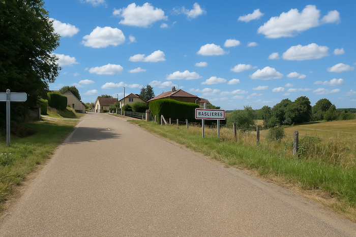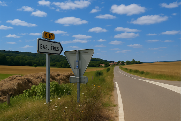 | Après la traversée de cette route animée, une petite route campagnarde s’engage, sinueuse et tranquille, en direction de Baslières, comme un dernier ruban paisible avant l’arrivée au village. |