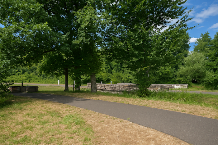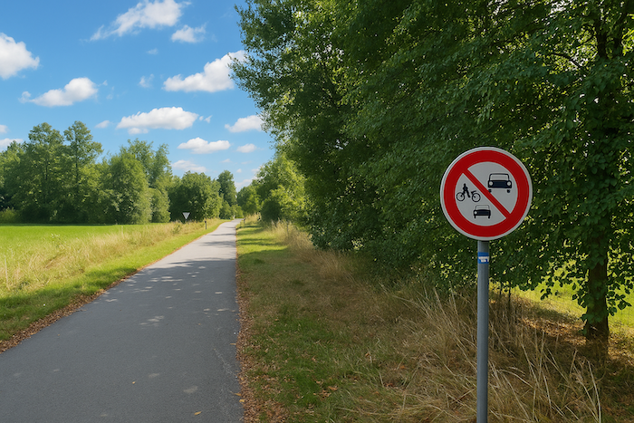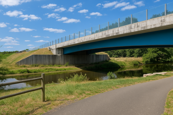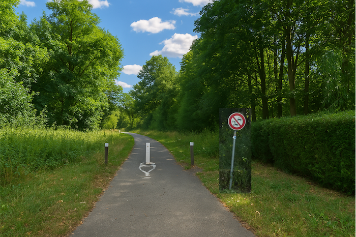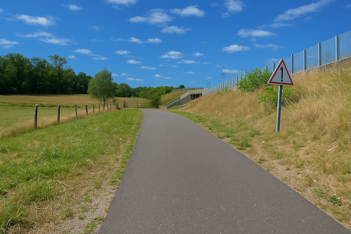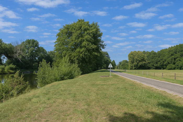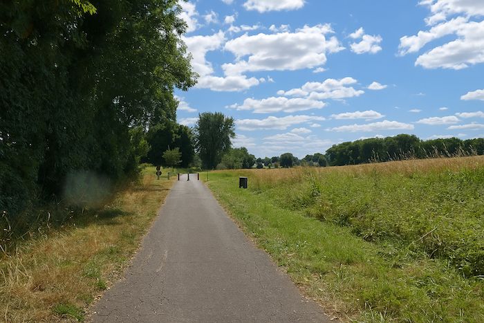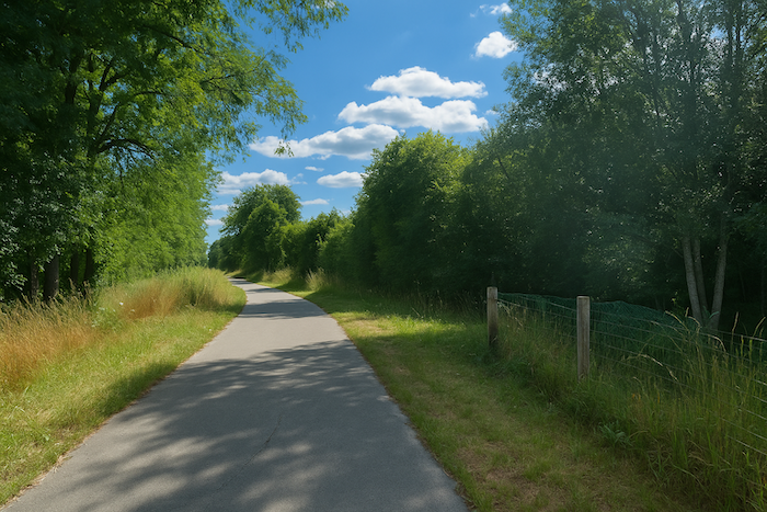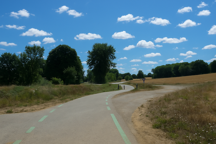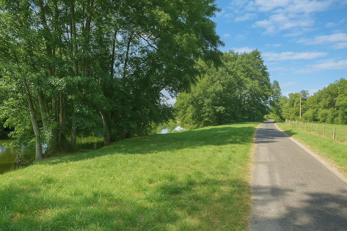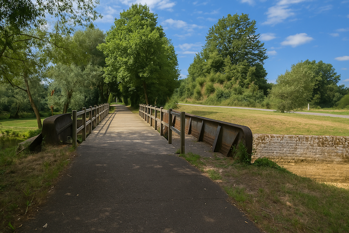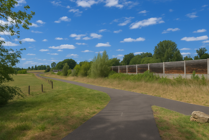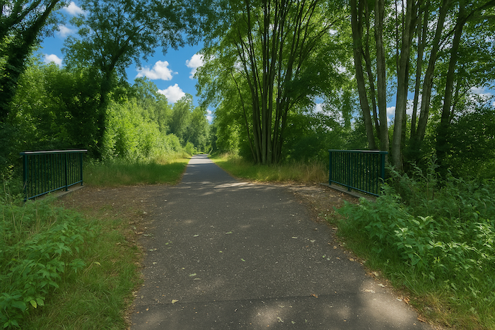 | Une fois cet entrelacs franchi, la piste cyclable reprend ses droits avec assurance, longeant de nouveau le cours tranquille de l’eau. Le rythme redevient apaisé, presque méditatif. |