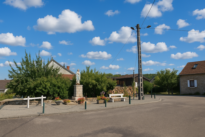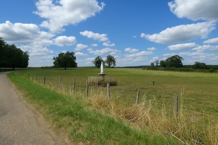 | À la sortie de ce paisible village, la route s’efface doucement dans l’étendue des champs, retrouvant la solitude champêtre. Là, au cœur des prés, une Vierge discrète veille dans la lumière douce du matin, telle une sentinelle immobile, gardienne des âmes et des terres, offrant une pause silencieuse et recueillie aux passants. |