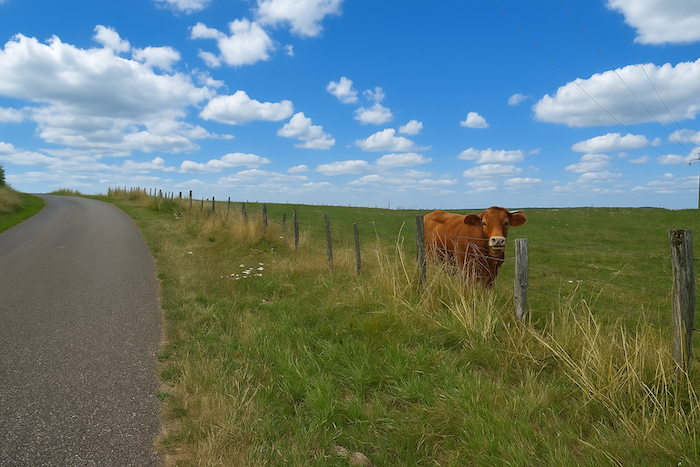 | Par bonheur, un troupeau de Montbéliardes vient parfois troubler cette monotonie, leurs robes tachetées de blanc et de brun apportant une touche de vie et de mouvement à cette étendue paisible. Plus loin, l’herbe douce et tendre prend le relais du chemin caillouteux, adoucissant la marche et invitant à la rêverie. |