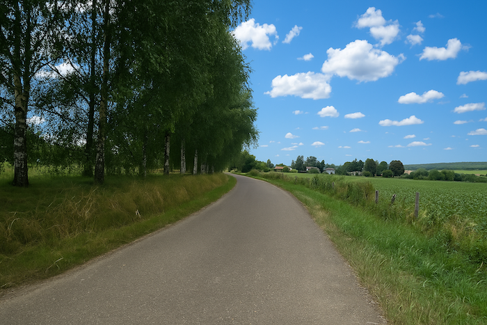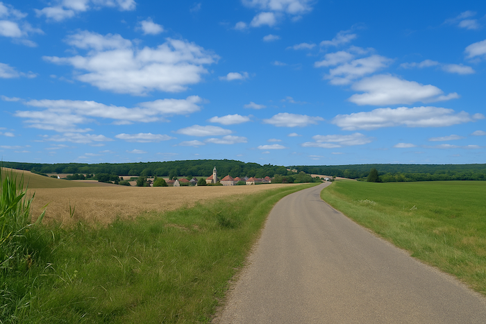 | La route, ici, se fait droite comme une promesse. Elle trace son sillon dans la campagne, tendue vers l’horizon. Marast, minuscule au début, grossit lentement, presque timidement, comme si le village attendait d’être apprivoisé. |