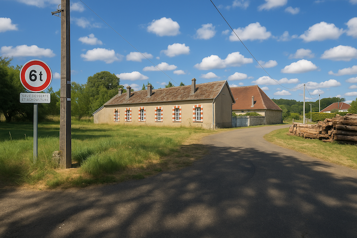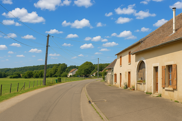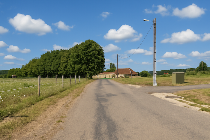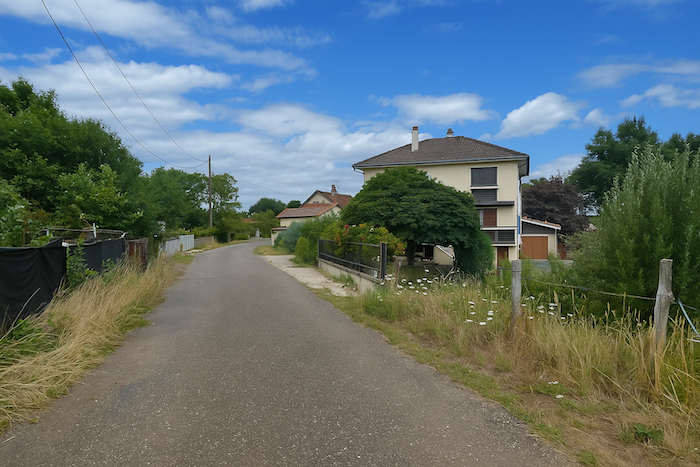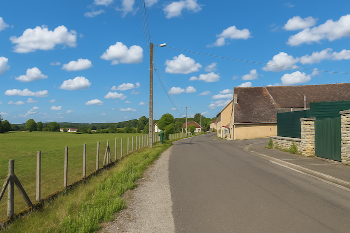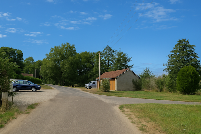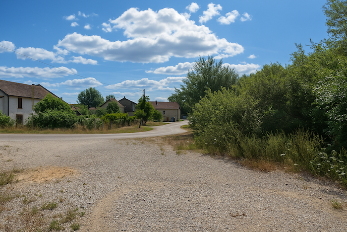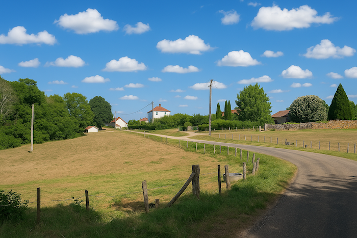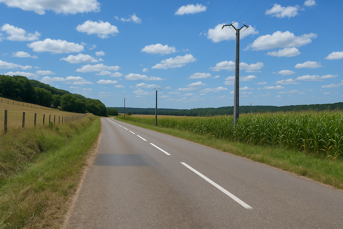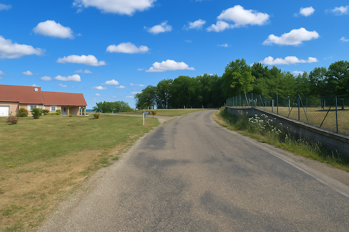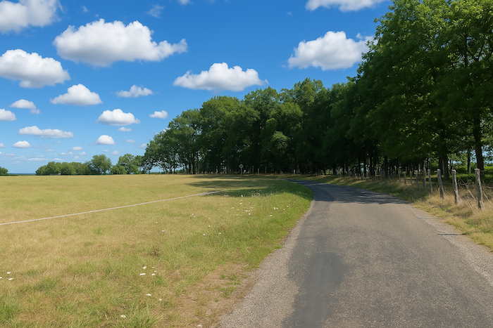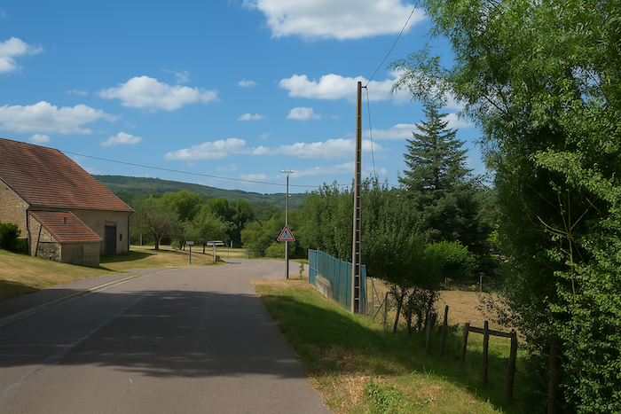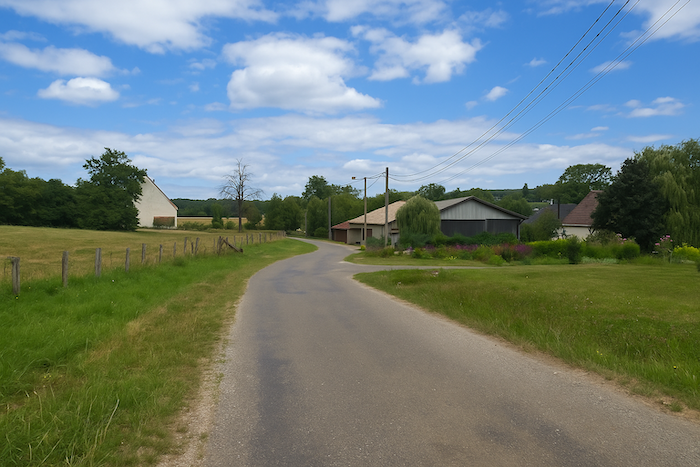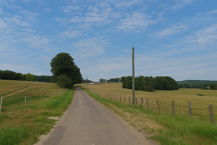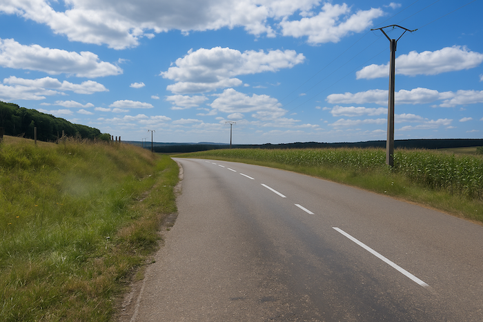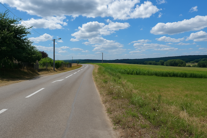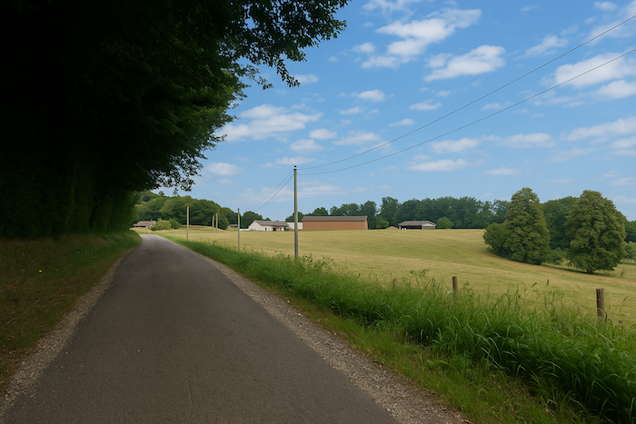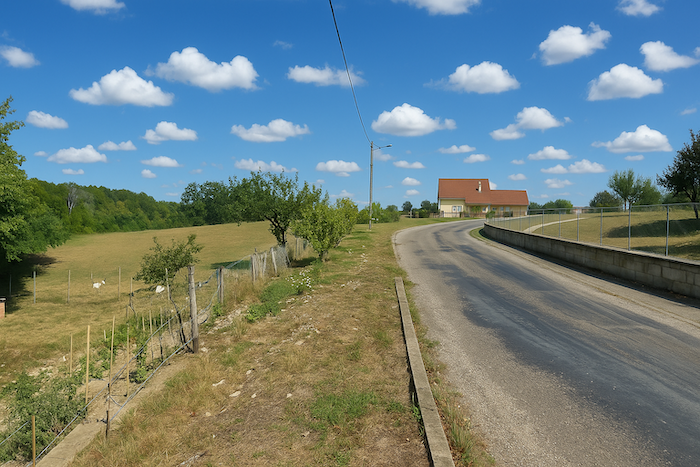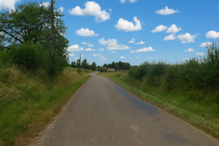 | Puis, comme un miracle attendu, la route s’incline vers la droite, modeste mais réelle, au lieudit Les Passières, peut-être jadis le site d’une gare oubliée. Ce virage, aussi discret soit-il, change la dynamique de la promenade, insufflant un souffle nouveau, une douceur bienvenue après la rectitude obstinée de la route. |
