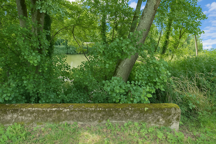 | Enfin, à l’angle de cette ferme, la route amorce une courbe, douce et arrondie, pour venir flirter avec une petite retenue d’eau. C’est une halte du regard, un apaisement. |