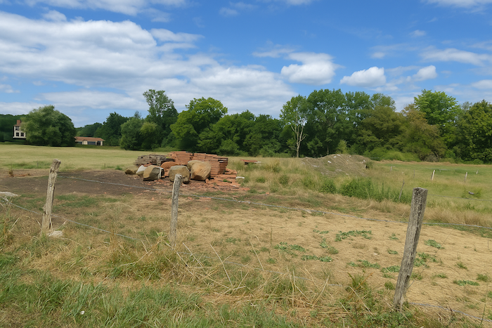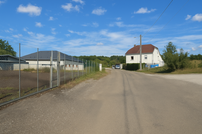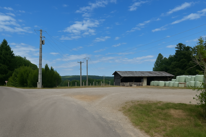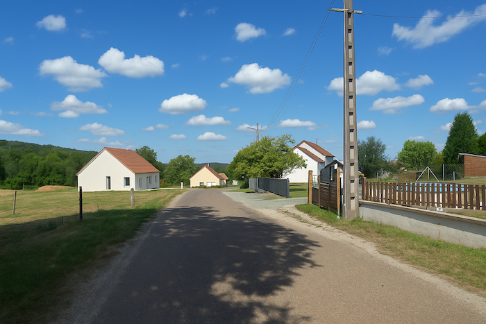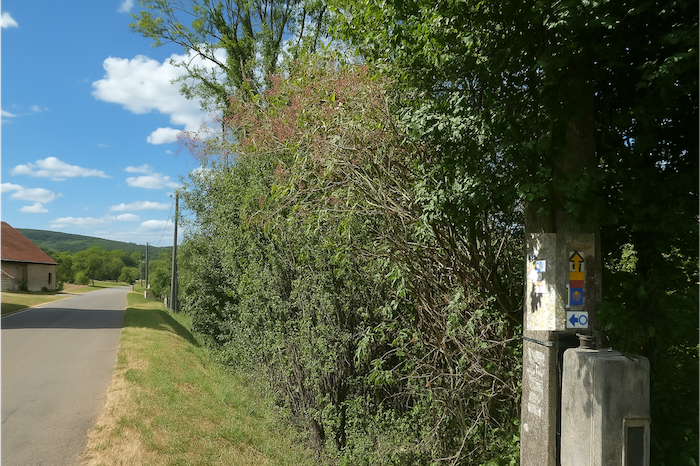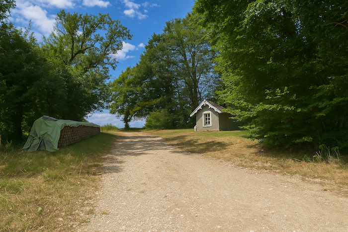 | Pour le kilomètre qui suit, votre regard sera captif des silhouettes austères d’un immense hangar en construction, dressé sur la colline comme une forteresse moderne. Lorsque vous reviendrez ici, peut-être l’édifice aura-t-il achevé sa métamorphose, imposant sa présence nouvelle au-dessus des prés ondoyants, des champs laissés en jachère et des étendues de maïs qui colorent la plaine alentour d’un patchwork vivant. |