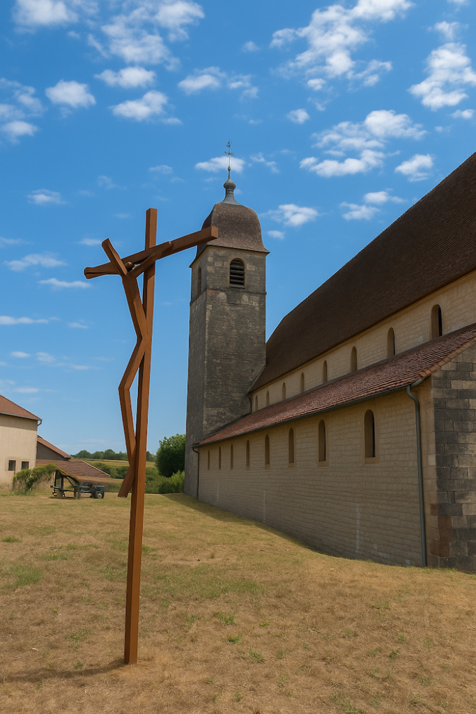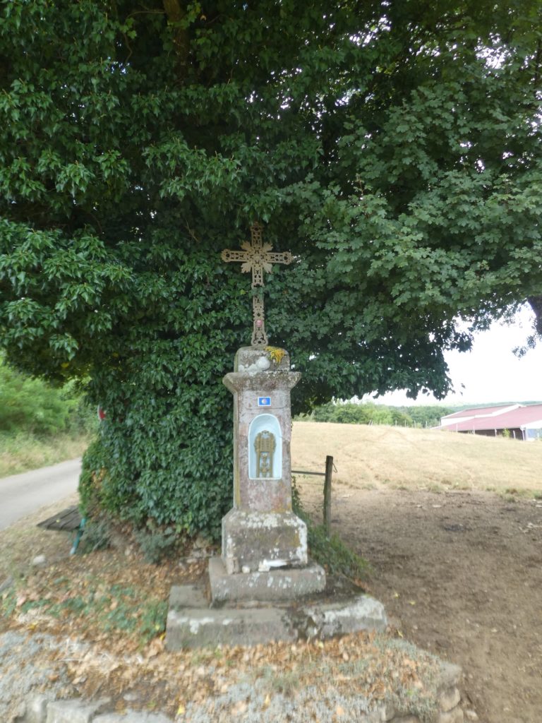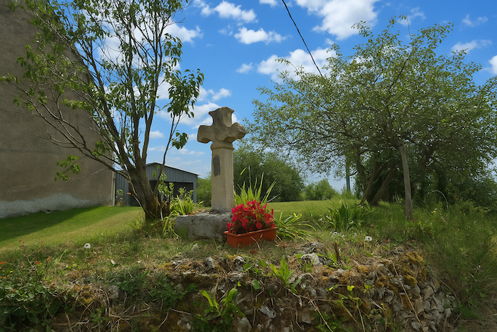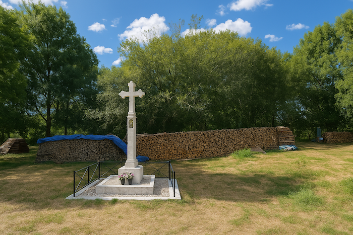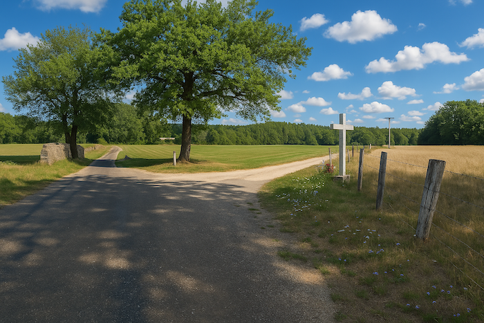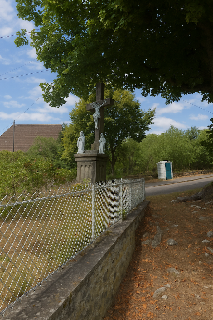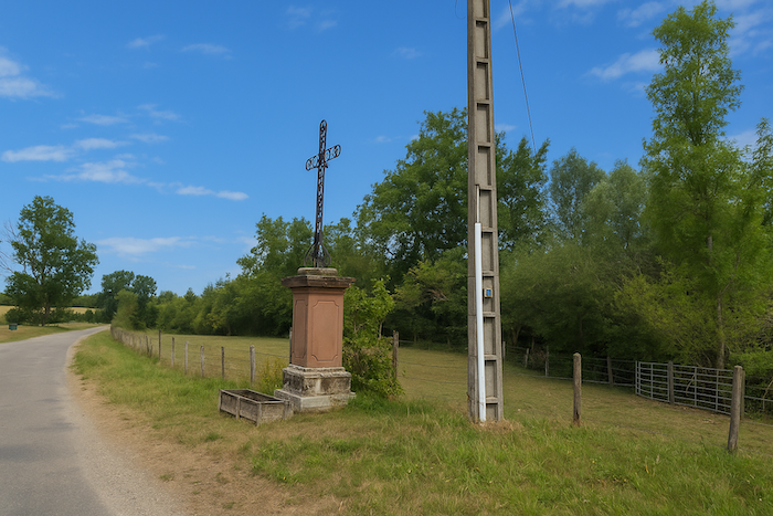 Bientôt, sur le bas-côté, une croix de fer s’élève, solidement posée sur un bloc de granite. Elle semble veiller, comme un phare d’âme dans la campagne, pointant la direction du silence et de la forêt.