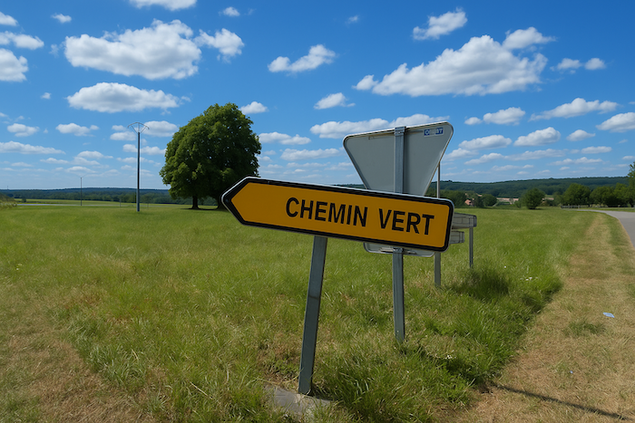 | Là, une indication discrète guide le marcheur vers le Chemin Vert, promesse d’une nouvelle aventure, d’un autre chapitre à parcourir. |