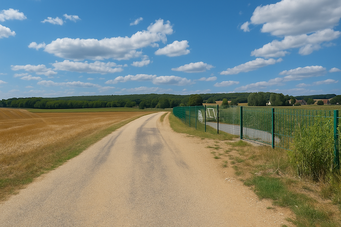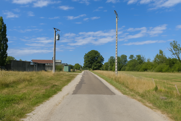 | Encore quelques pas, et la route quitte ce théâtre ombragé pour se diriger calmement vers une station d’épuration. Rien d’inquiétant ici : le terrain reste plat, la progression facile. C’est un passage modeste, presque effacé, comme une respiration entre deux mouvements plus amples. |