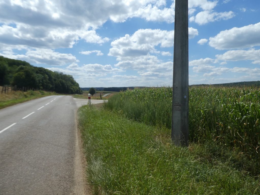 | Après un long passage sous la voûte protectrice des bois, le paysage s’ouvre de nouveau sur la campagne nue, marquée par la succession monotone des champs de maïs, austères et peu accueillants, aux teintes dorées ou fanées selon la saison. |