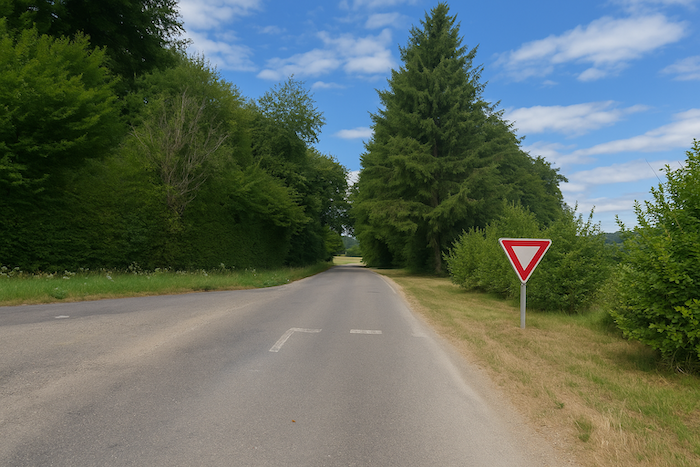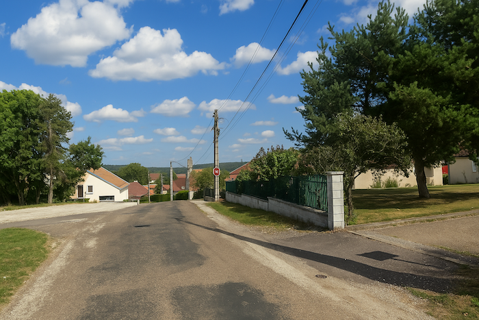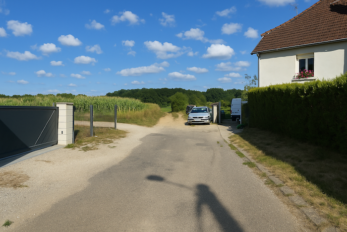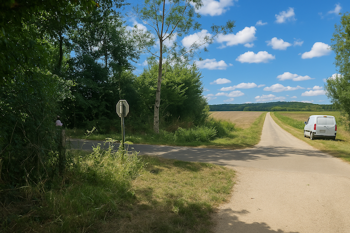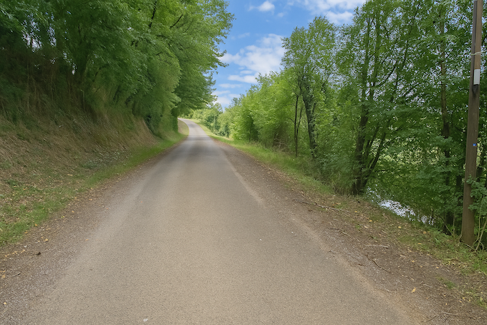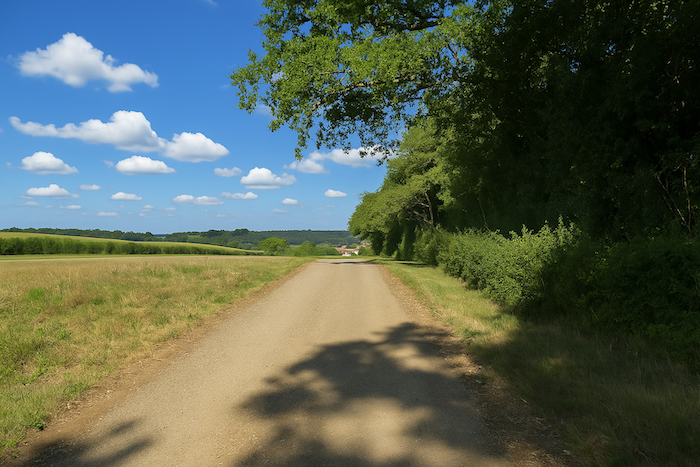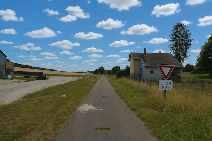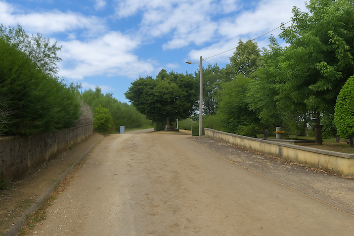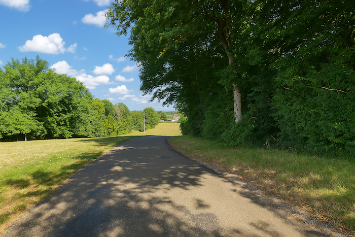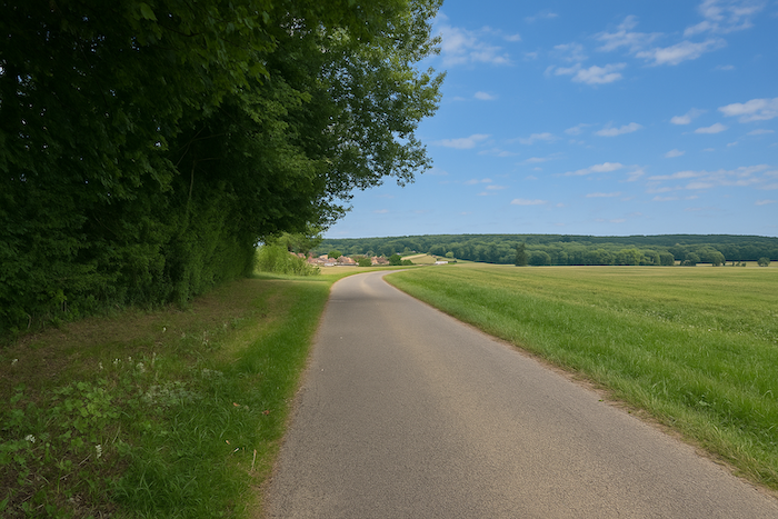 | Pour atteindre ce chemin, il faut d’abord emprunter un court tronçon de la route de Dampierre, où la circulation se fait rare et mesurée, presque complice du calme environnant. |