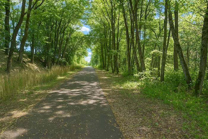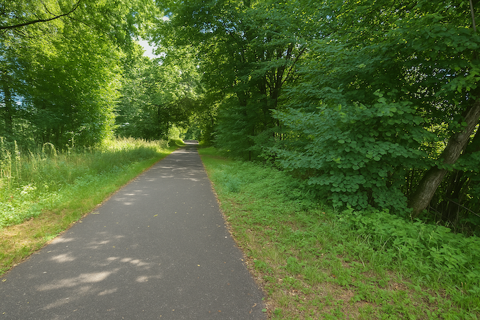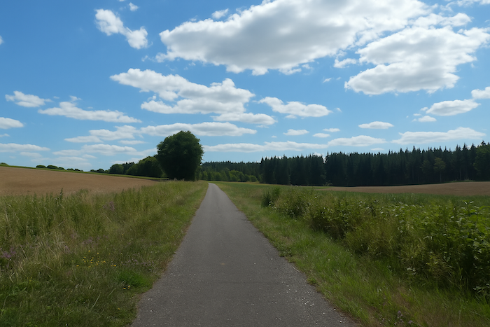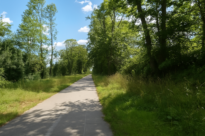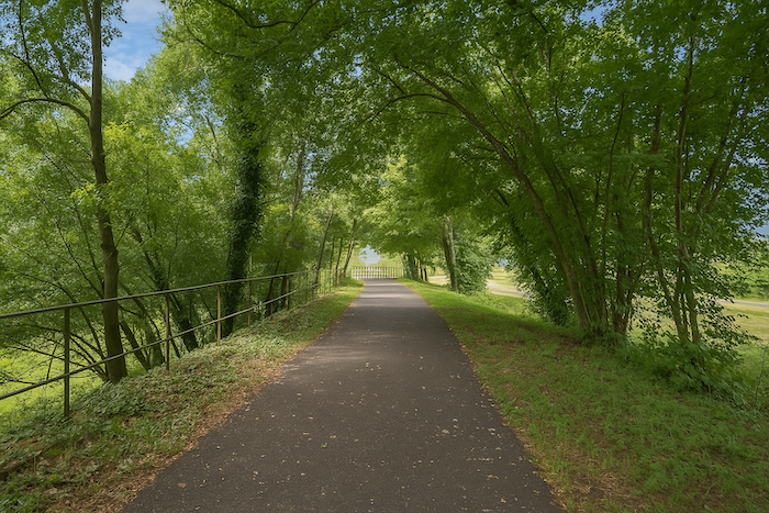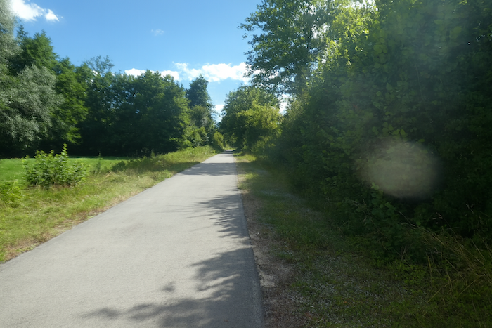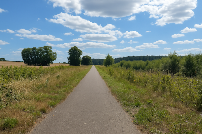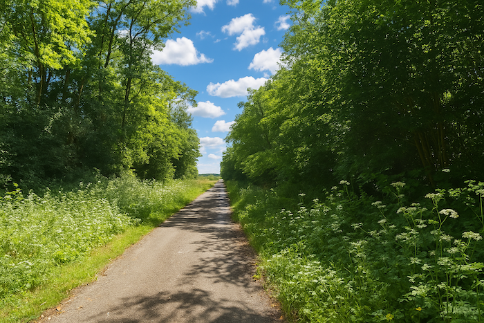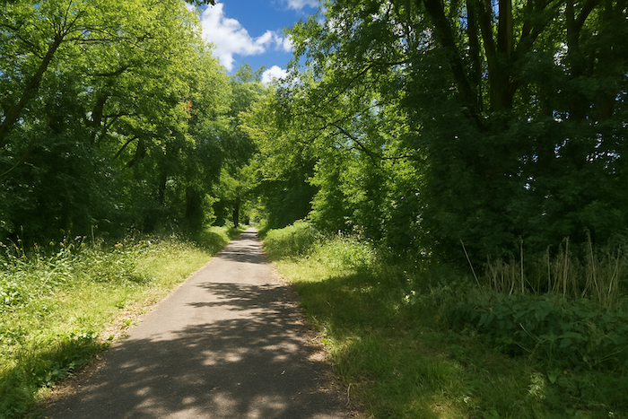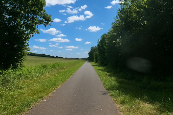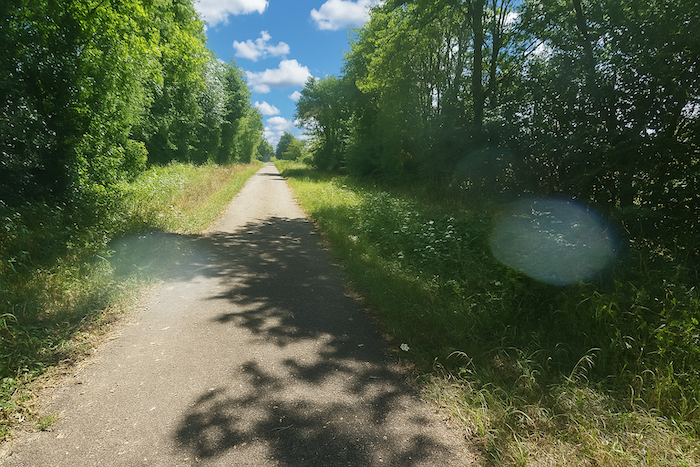 | Le Chemin Vert, long d’une trentaine de kilomètres, est aménagé sur l’emplacement d’une ancienne voie ferrée qui reliait autrefois Vesoul à Besançon. Le train a disparu, mais l’esprit du voyage demeure comme un clin d’œil à l’histoire ferroviaire transformée. Le Chemin Vert s’étire alors, droit et loyal, l’axe préféré des trains d’antan, et vous vous engagez pour une marche de plus de quatre kilomètres sur un revêtement goudronné, un ruban noir serpentant à travers champs et bois. |