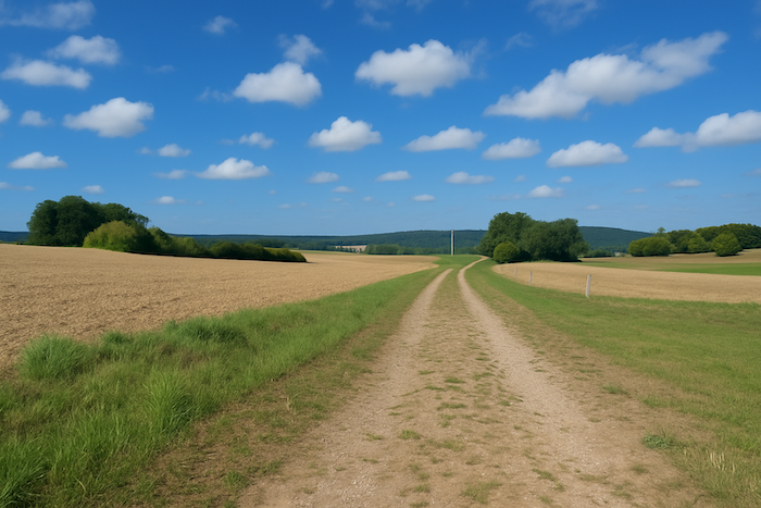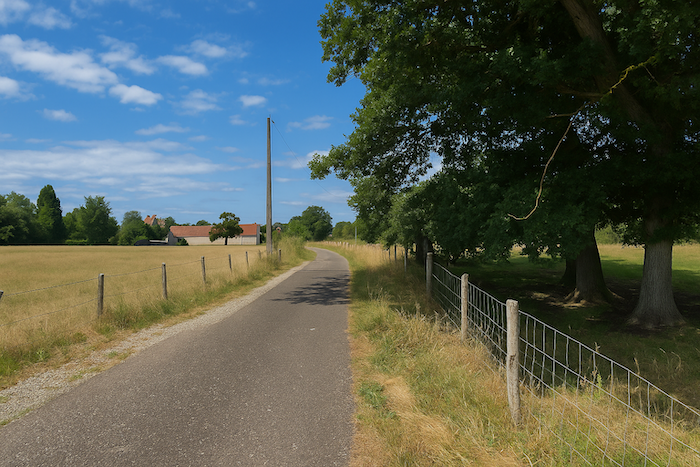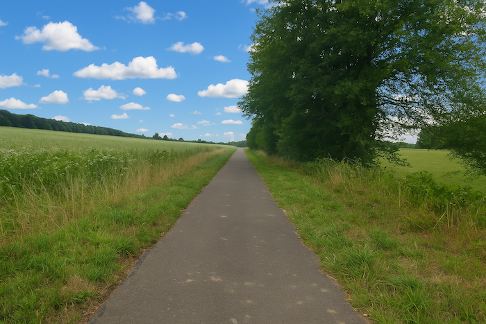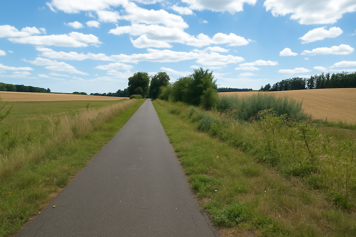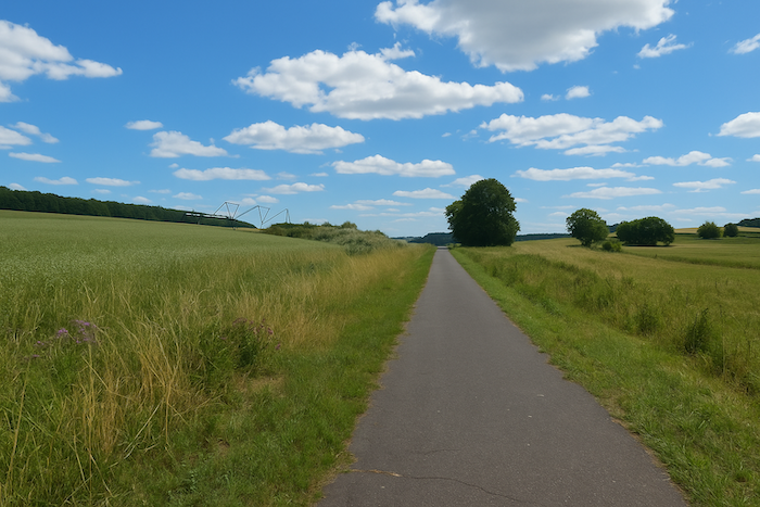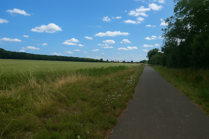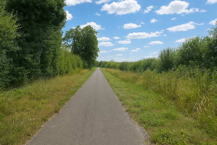 | Les deux kilomètres suivants se déroulent encore en ligne droite, sans détour. Une dame avance d’un pas assuré, presque pressée, semblant isolée dans cet espace vaste. Pourtant, ne vous y trompez pas : vous croiserez ici de nombreux cyclotouristes, surtout les week-ends, quand les chemins s’animent de vies multiples, de sourires échangés et de dialogues sans paroles. |