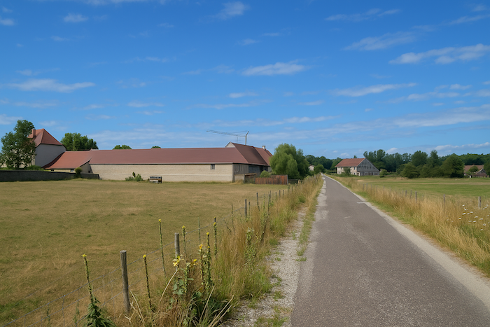 Un peu plus loin, au détour d’un champ, une ferme massive se détache du paysage. Ses murs anciens semblent contenir des siècles de labeur et de patience.