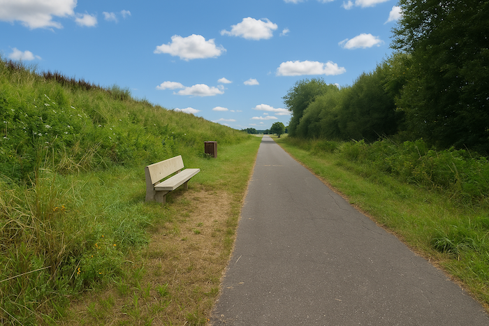 | Les pistes cyclables divisent souvent les opinions : on les aime ou on les déteste, surtout lorsqu’elles refusent obstinément de tourner, semblant s’étirer en une ligne sans fin. Ici, un banc a été offert, un humble refuge pour le promeneur ou le cycliste épuisé. Mais qui oserait s’arrêter, que pourrait-on admirer dans ce paysage si peu séduisant, dépourvu de ces beautés sauvages qui font battre le cœur ? |