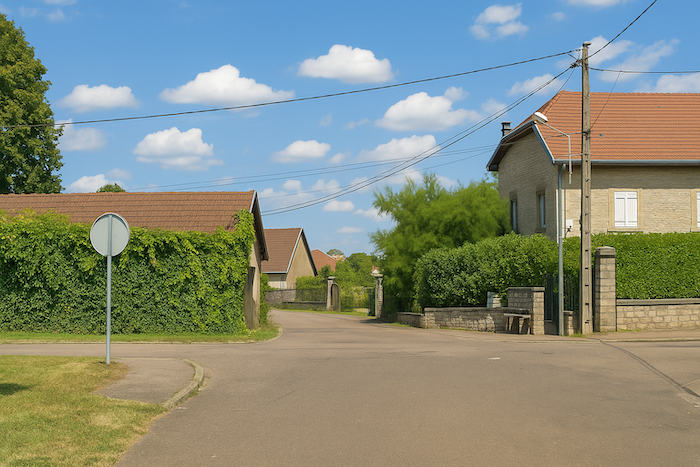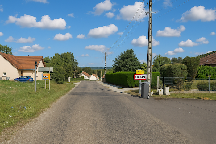 | Très vite, Filain se dessine devant vous, simple et accueillant, posé au milieu des champs comme une halte paisible. La route s’engage alors dans les lotissements récents qui marquent l’entrée du village, contrastant doucement avec l’ancienneté des lieux. |