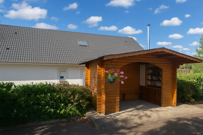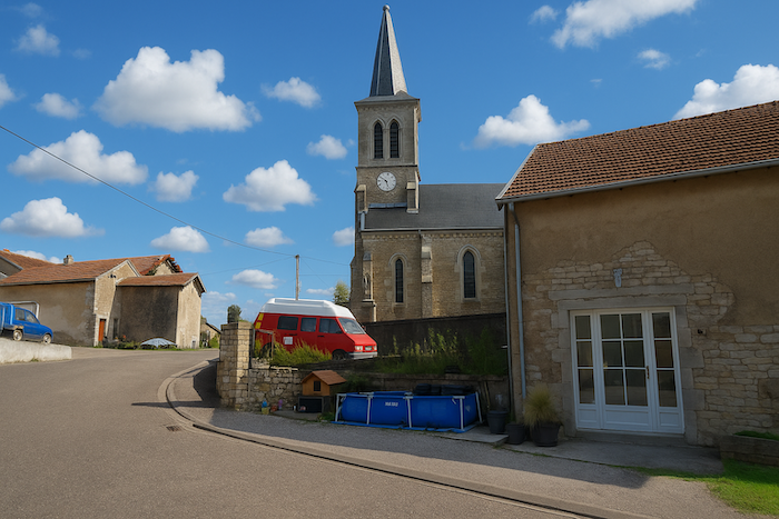 | Sur la Place de la Convivialité, une bibliothèque libre semble offrir un refuge à l’esprit, tandis qu’une Vierge veille silencieusement, veillant à la sérénité du lieu, devant l’église qui veille elle aussi, comme une mère attentive au cœur du village. |