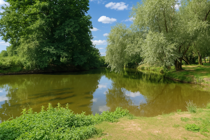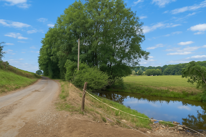 | Puis, la rivière reparaît, fidèle et complice. À son bord, des pêcheurs silencieux tendent leurs lignes sous l’ombre accueillante des hêtres et des chênes. Il y a là, dans l’air tiède, une forme de paix rurale, presque pastorale, que seuls les battements d’ailes ou les glissements d’eau viennent troubler. |