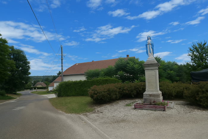 | À la sortie du village, la pente s’adoucit davantage, comme si le chemin lui-même voulait nous inviter à ralentir. Là, en contrepoint du paysage, une Vierge veille, toute de bleu et de blanc vêtue. C’est une vision familière dans ces campagnes franc-comtoises : la foi ancrée dans la pierre, au détour d’un chemin. |