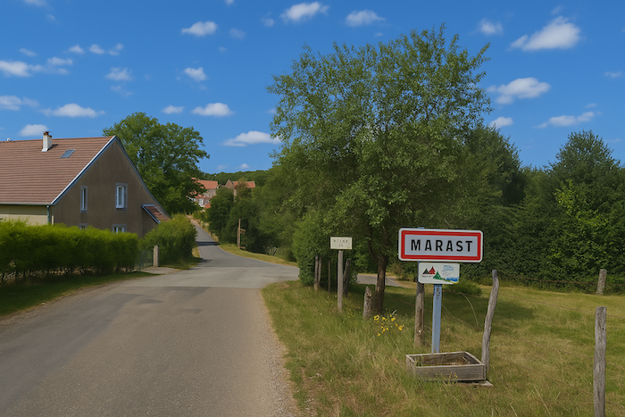 | À l’approche de Marast, la route se fait village. Un filet d’eau, la Bossole, coule paisiblement à l’entrée, comme une caresse offerte au bétail. L’ensemble est harmonieux, calme, uni par cette discrète beauté que les villages francs-comtois savent conserver. |