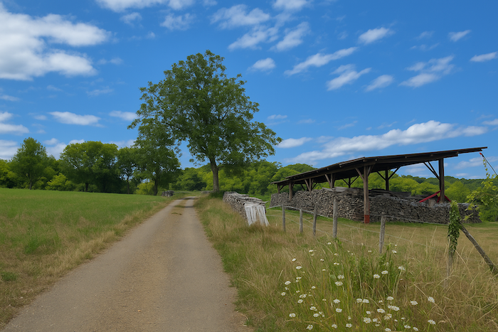 | Depuis le village, une route aux allures de promesse s’élève doucement : c’est la Rue de Compostelle, comme un écho à d’autres chemins, plus lointains, mais frères. . |