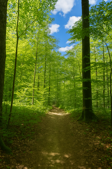 | Au départ, la forêt s’offre dans toute sa splendeur, une cathédrale végétale où les arbres s’élancent vers le ciel comme des colonnes vivantes. |