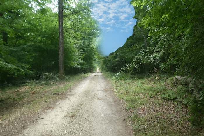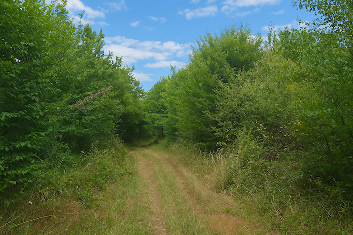| La piste s’est enfin laissée aller à la courbe. Mais bientôt, elle reprend sa rigueur, se déployant à nouveau en ligne droite, quoique désormais souvent protégée sous l’ombre familière des feuillus. |