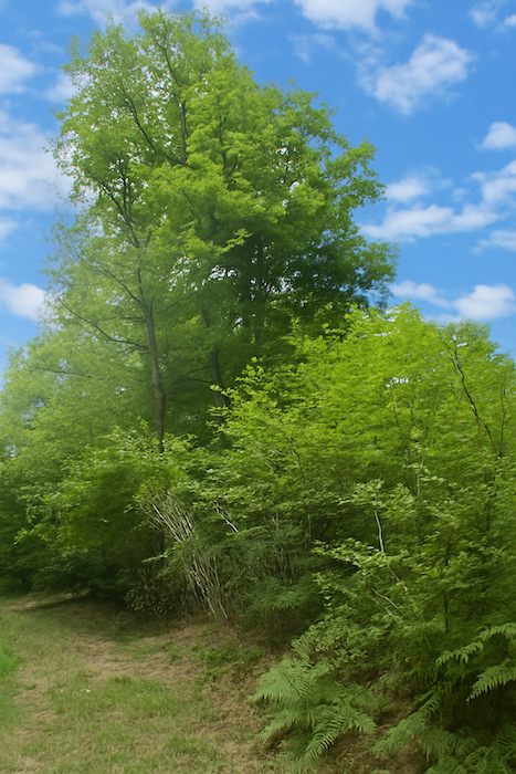 | Ici, les érables, timides, percent la canopée, mêlant leurs jeunes feuilles aux rejets de hêtres et aux chênes rabougris, comme une palette délicate d’espoir et de renouveau. |