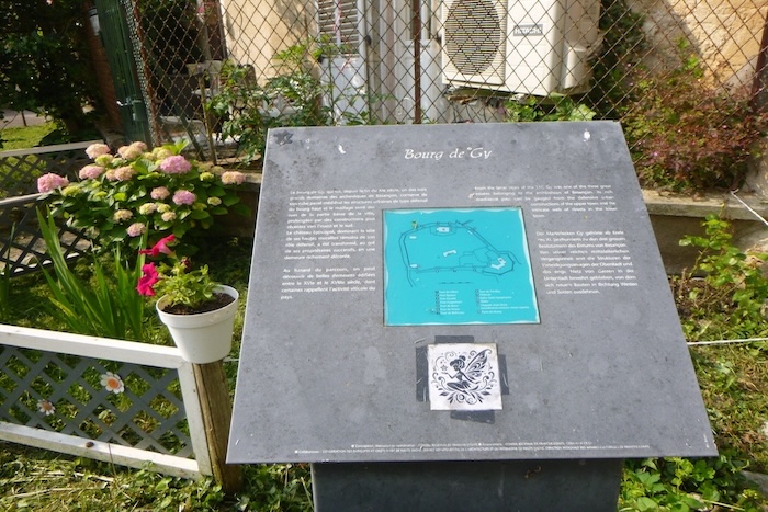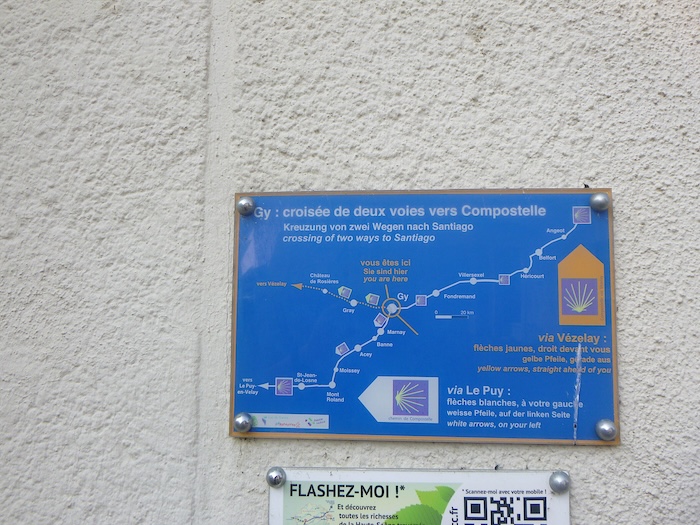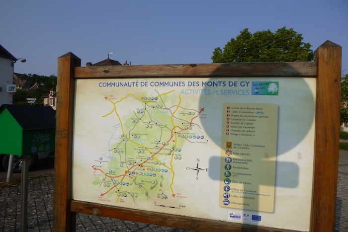 | A Gy, devant la mairie, un grand panneau prétend informer le visiteur des possibilités touristiques locales. Mais cet amas de textes et d’images, trop dense et trop vague, se révèle inutile au pèlerin. Il promet tout et ne montre rien, comme une carte du ciel où manquent les étoiles. L’œil s’y perd et l’esprit n’y trouve pas la direction attendue. À cet instant, le marcheur n’est guidé que par son instinct, davantage que par ce catalogue figé de promesses illisibles. |