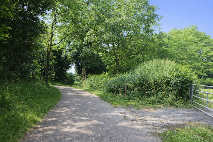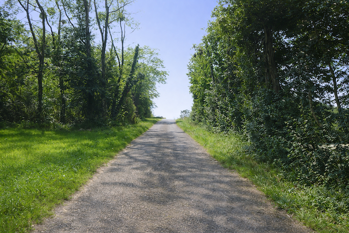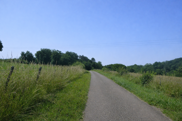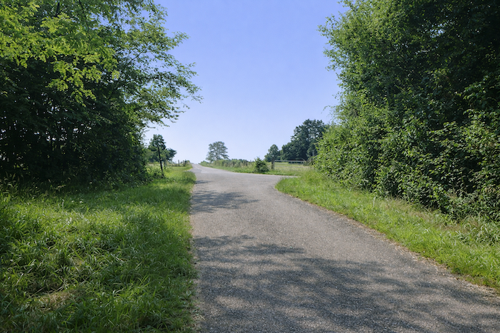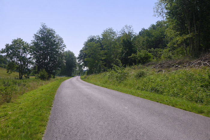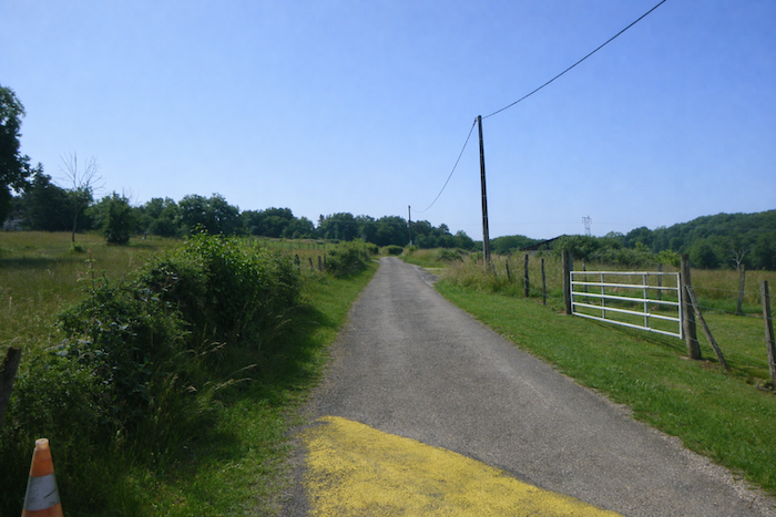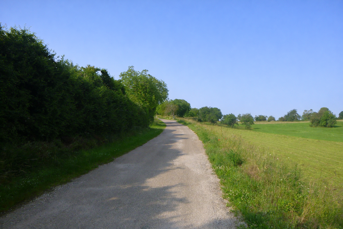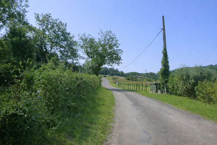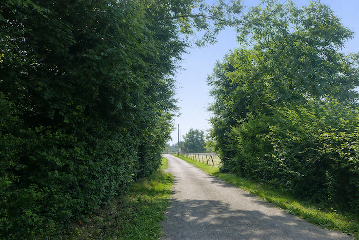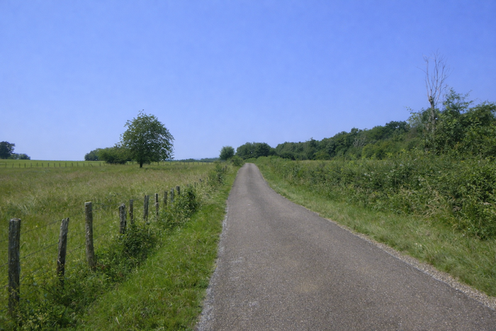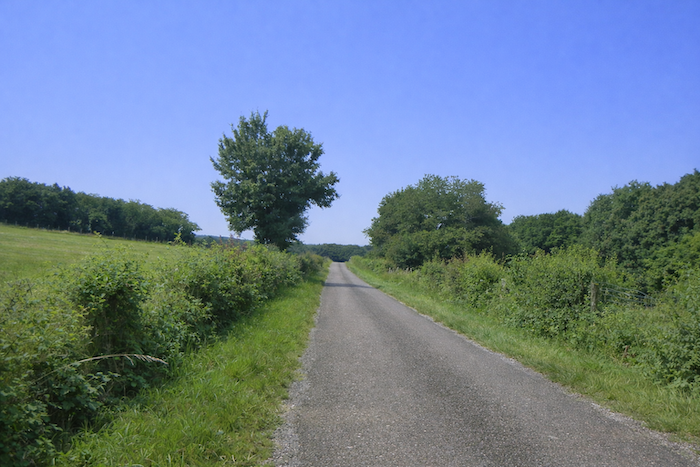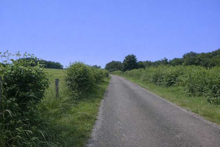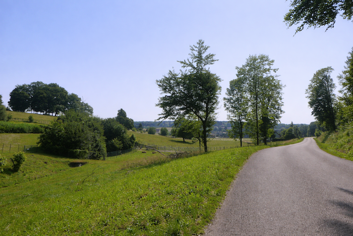 | La route, étroite et sinueuse, s’infiltre dans les prés et les bosquets, descendante comme une respiration tranquille. |