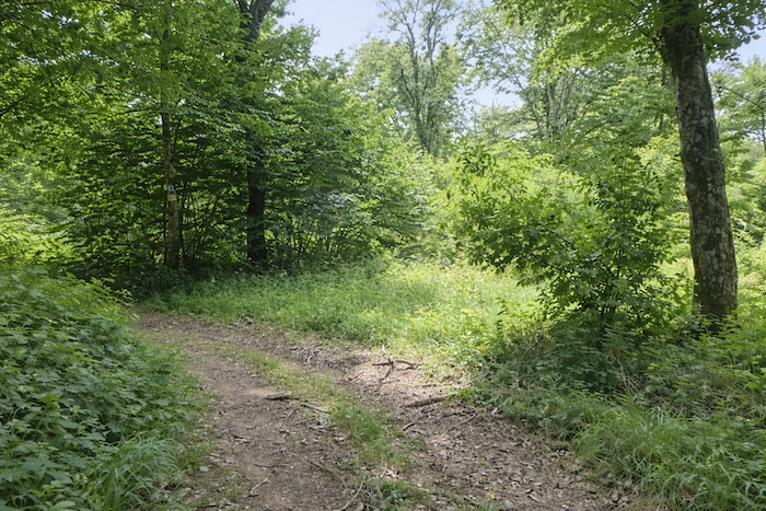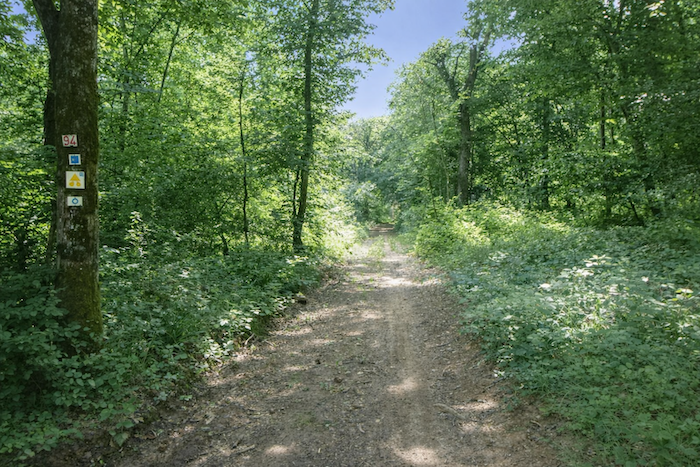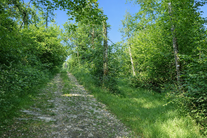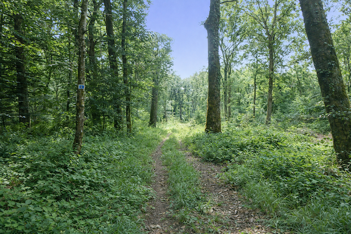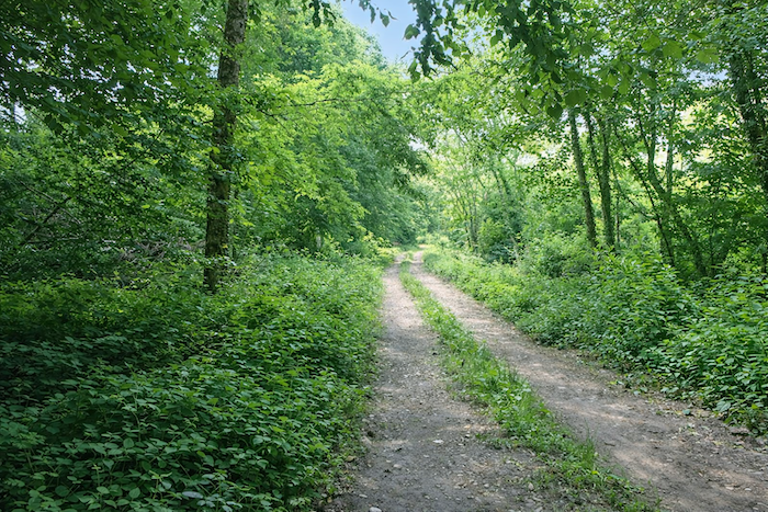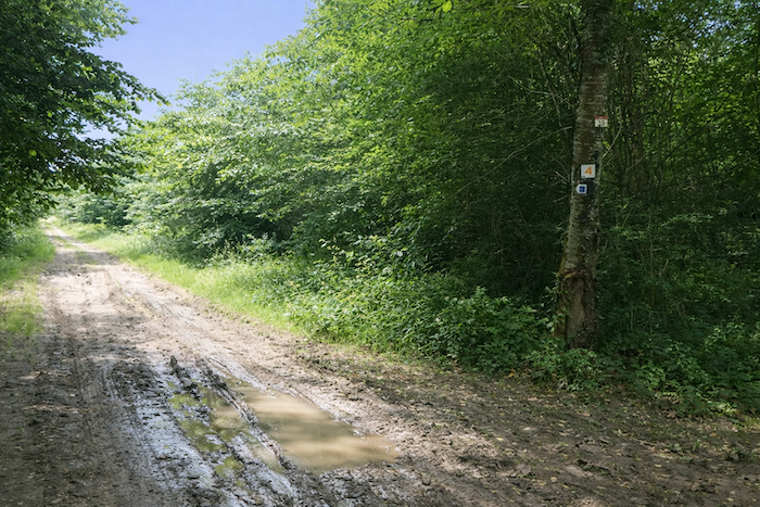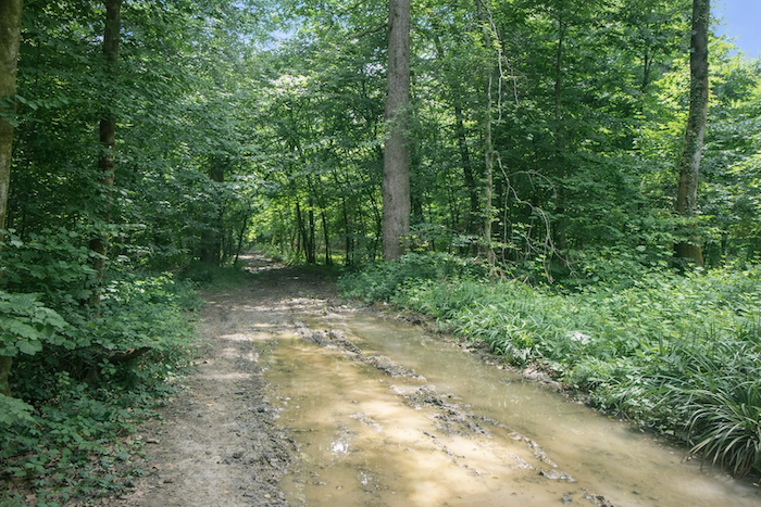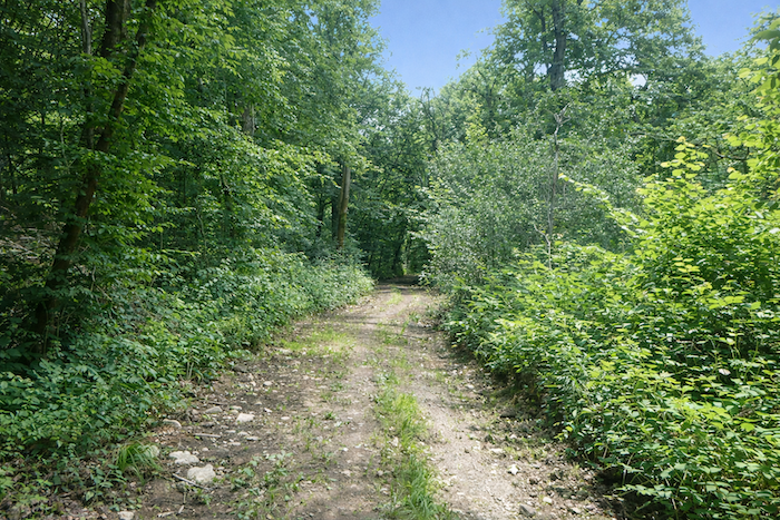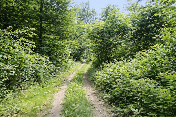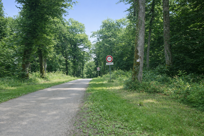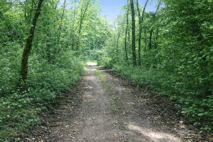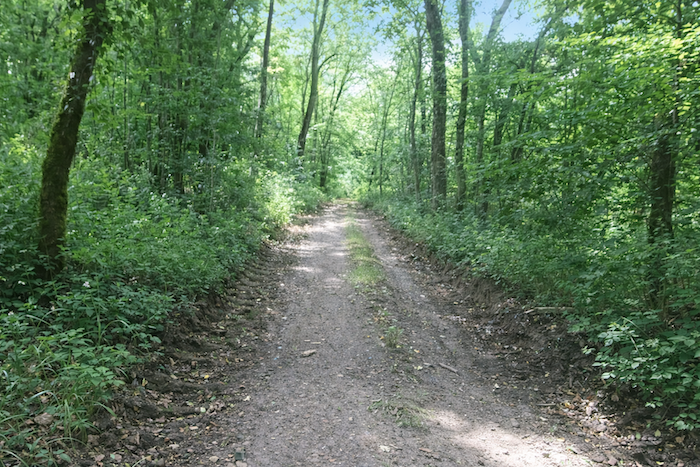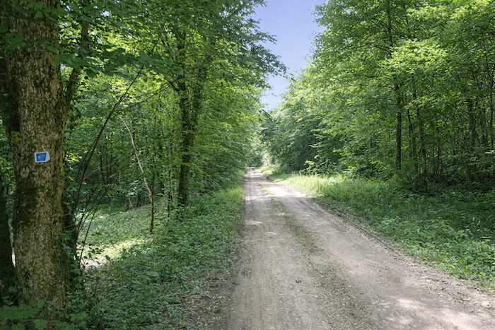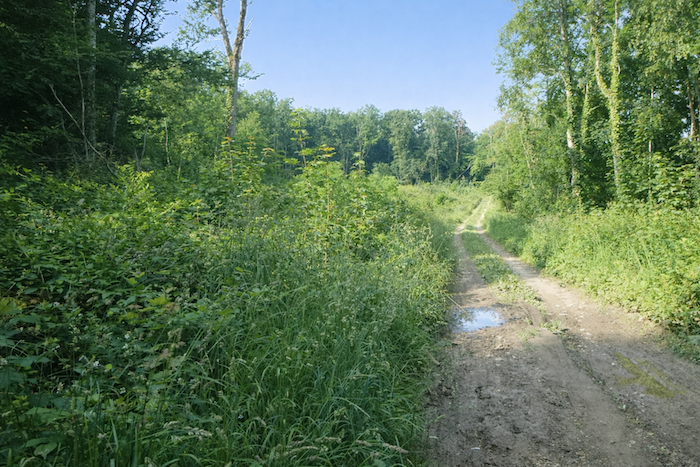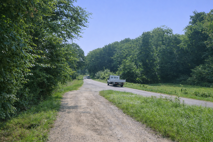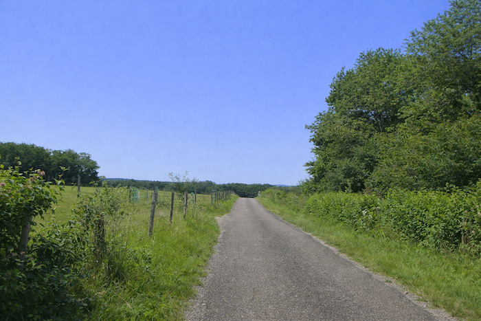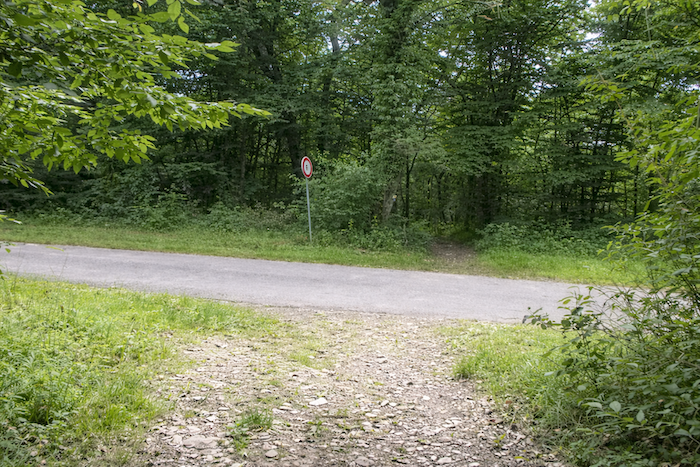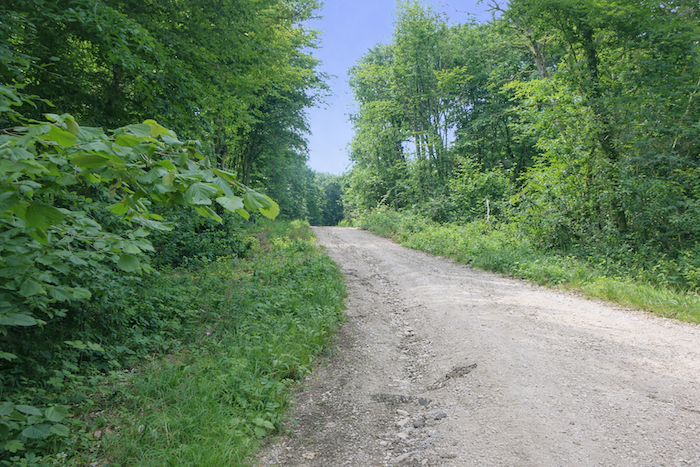 | Après près de trois kilomètres de balade au cœur de ce sanctuaire boisé, sans âme humaine à l’horizon, seul accompagné du concert des oiseaux et du froissement des feuilles, le chemin finit par croiser une petite route. Elle paraît discrète, presque clandestine, sans doute tracée uniquement pour les besoins des exploitants du bois. Ce ruban étroit, perdu dans la verdure, contraste avec le silence solennel des sous-bois. |