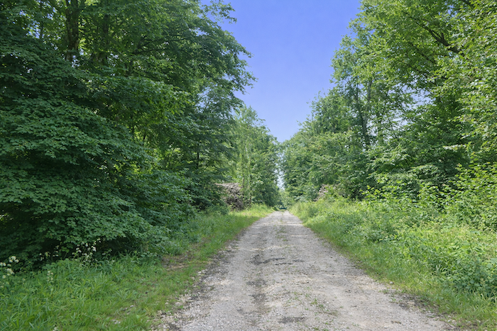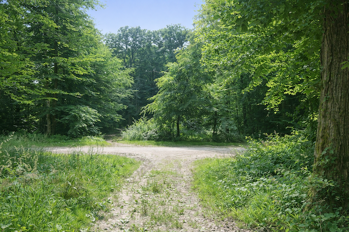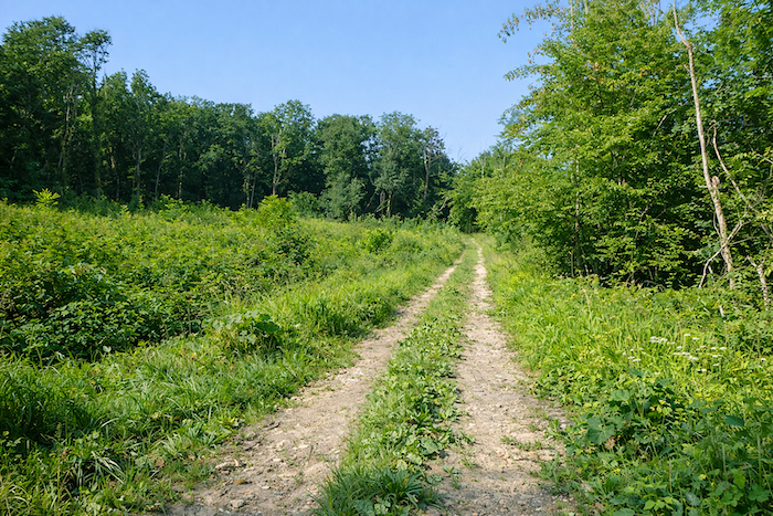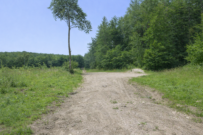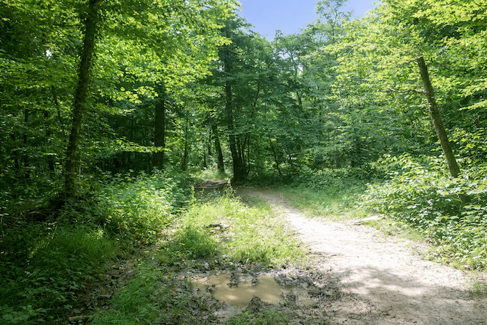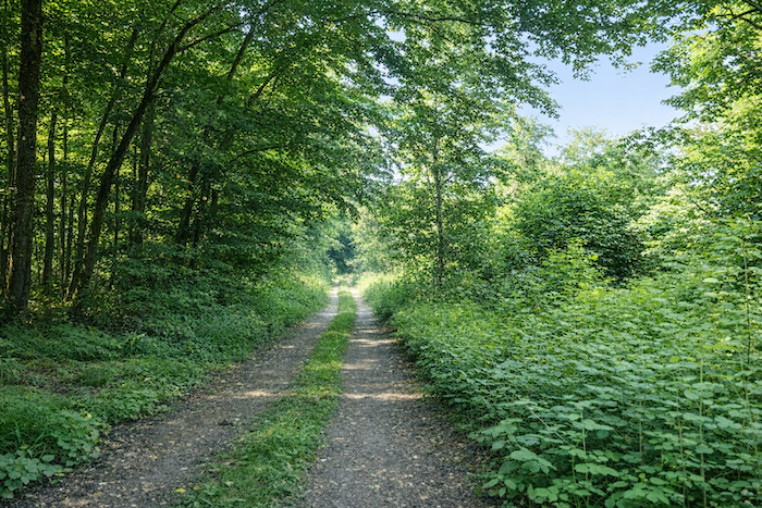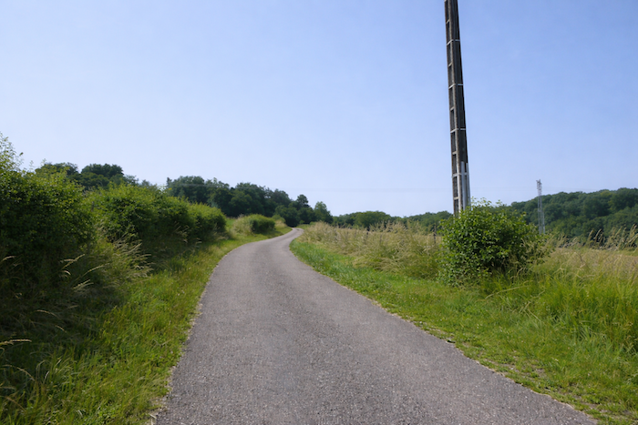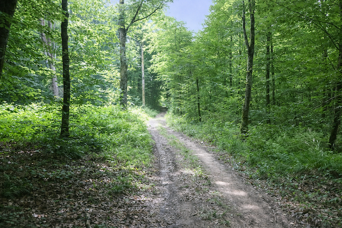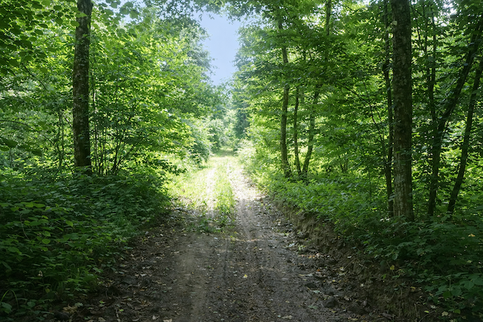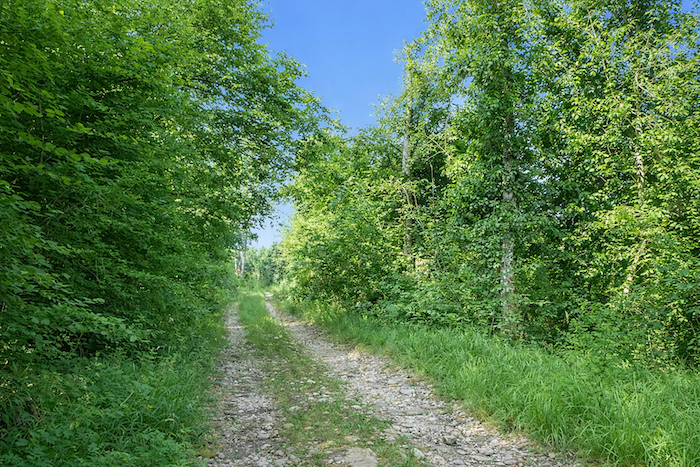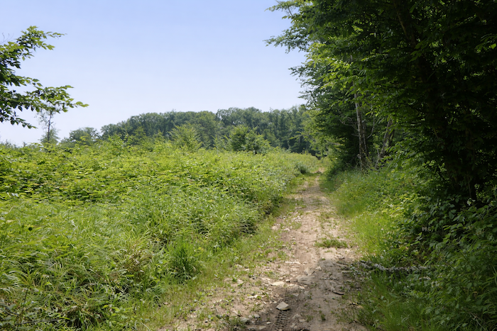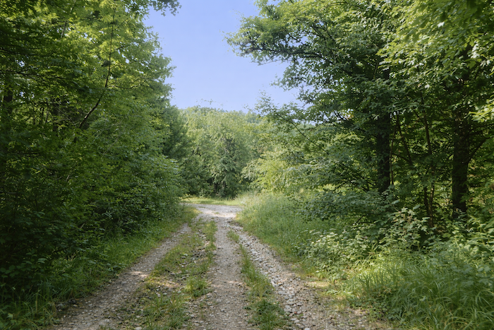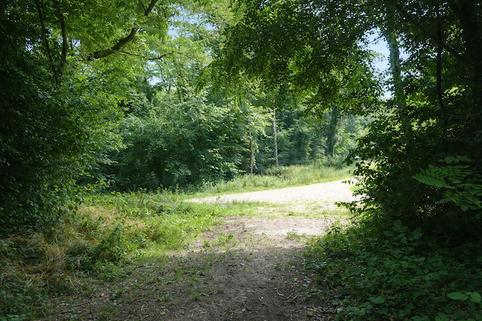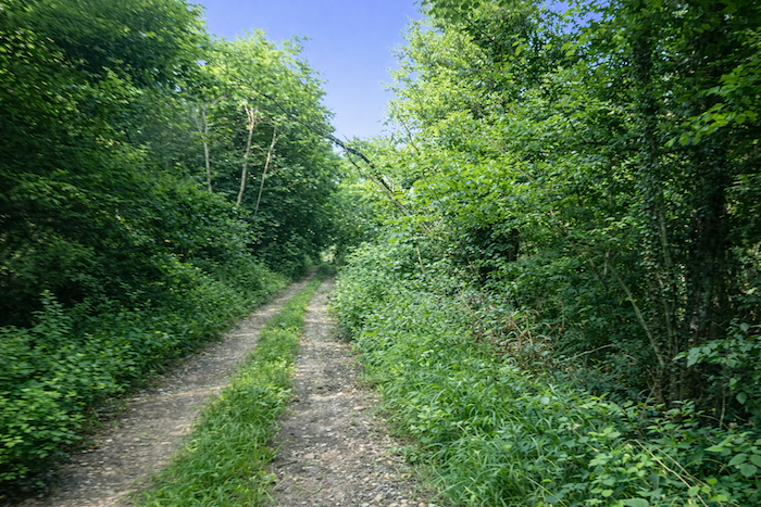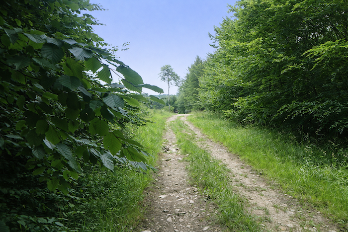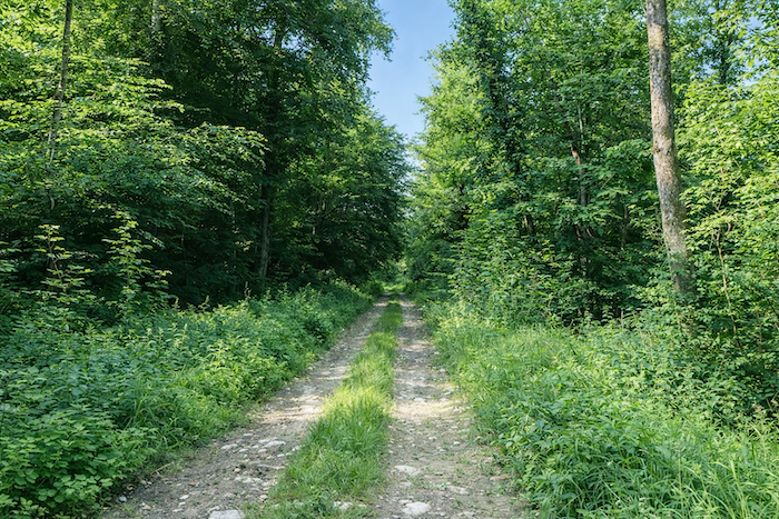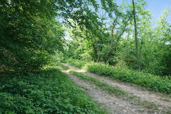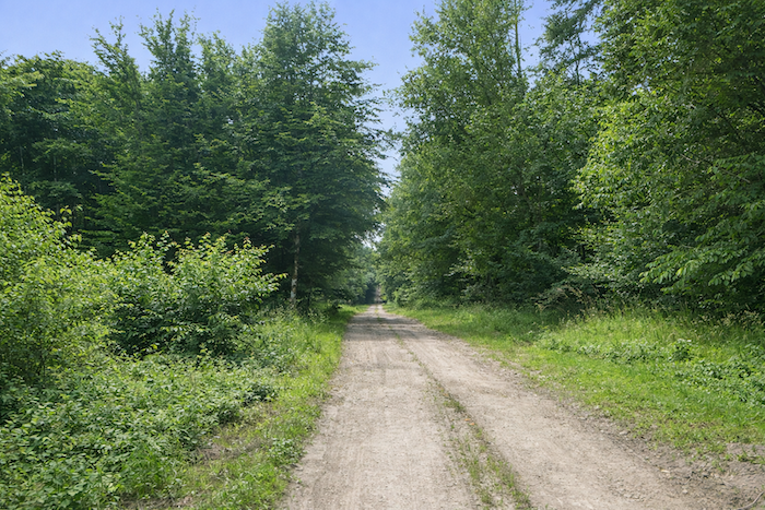 | Après près de trois kilomètres de balade au cœur de ce sanctuaire boisé, sans âme humaine à l’horizon, seul accompagné du concert des oiseaux et du froissement des feuilles, le chemin finit par croiser une petite route. Elle paraît discrète, presque clandestine, sans doute tracée uniquement pour les besoins des exploitants du bois. Ce ruban étroit, perdu dans la verdure, contraste avec le silence solennel des sous-bois. |