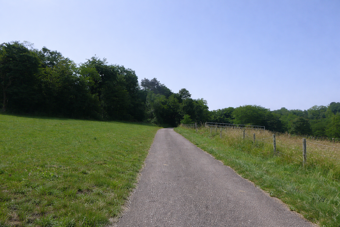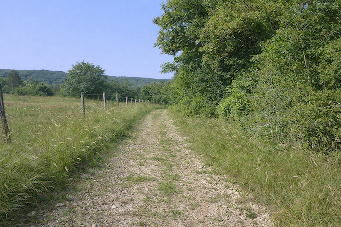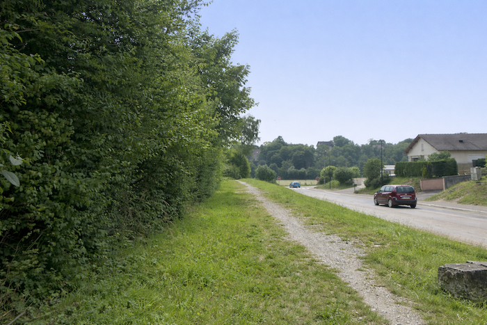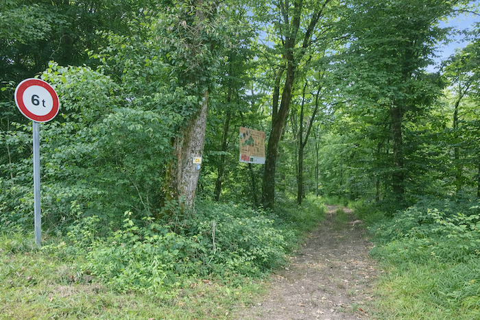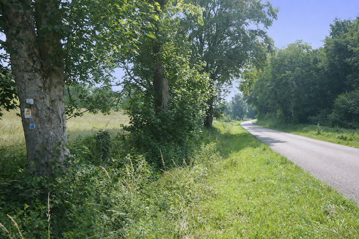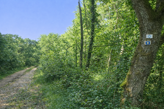 | Au bas de la descente, toujours dans le sous-bois, le large chemin rejoint la route départementale D225. C’est une voie tranquille, peu fréquentée, qui s’insère avec douceur dans le paysage et ne trouble pas le calme de la marche. |