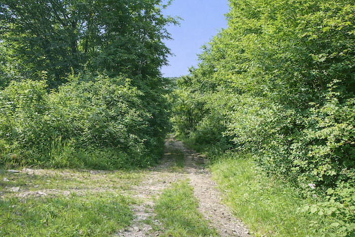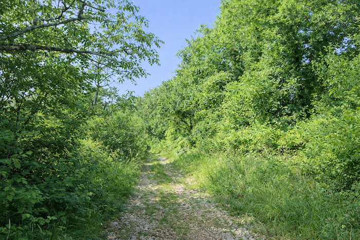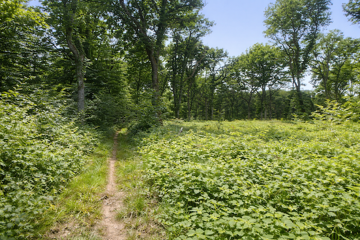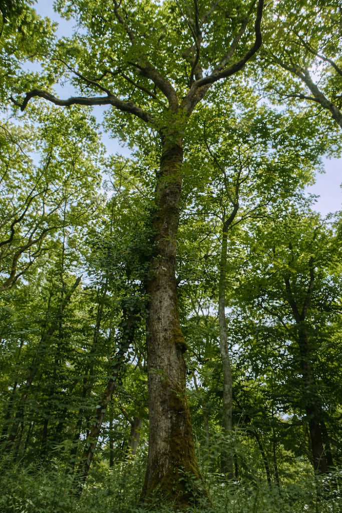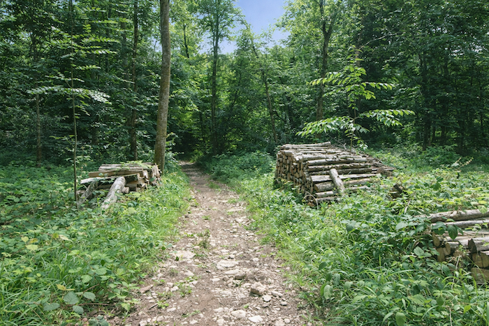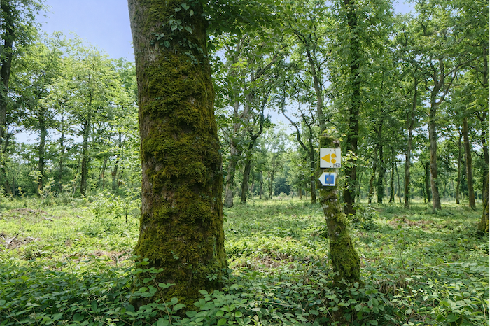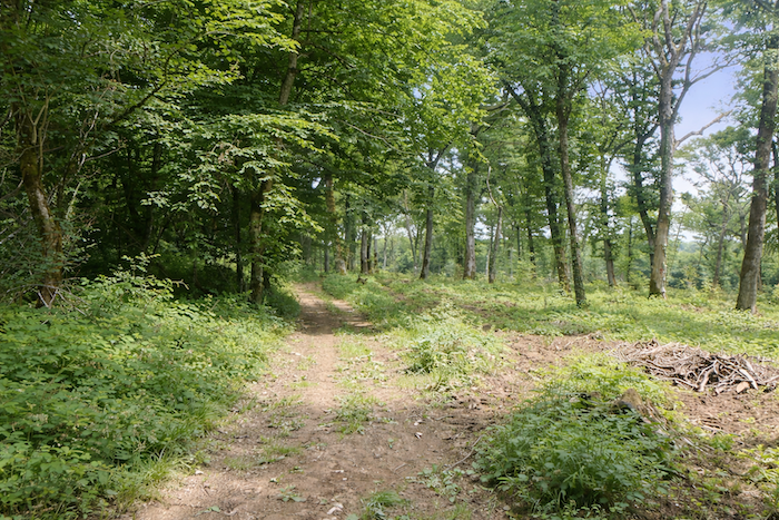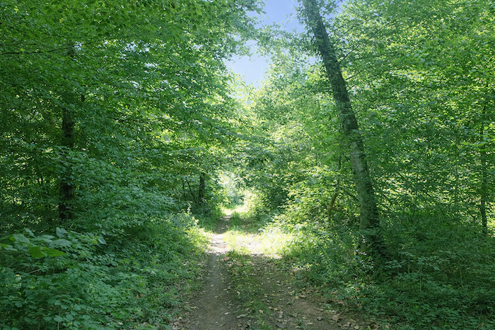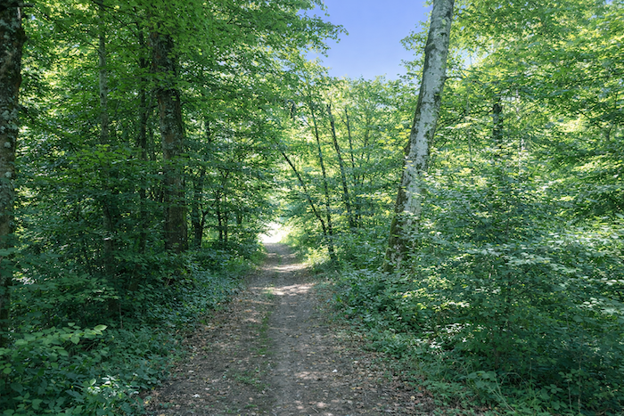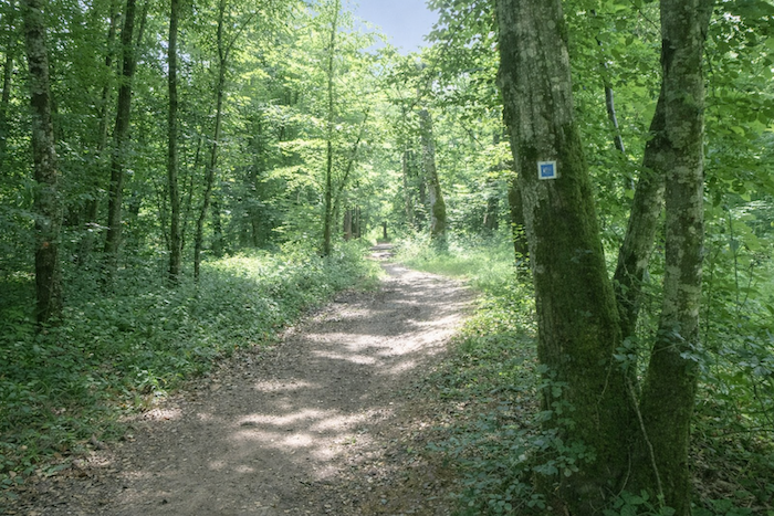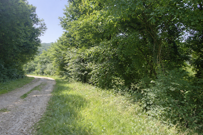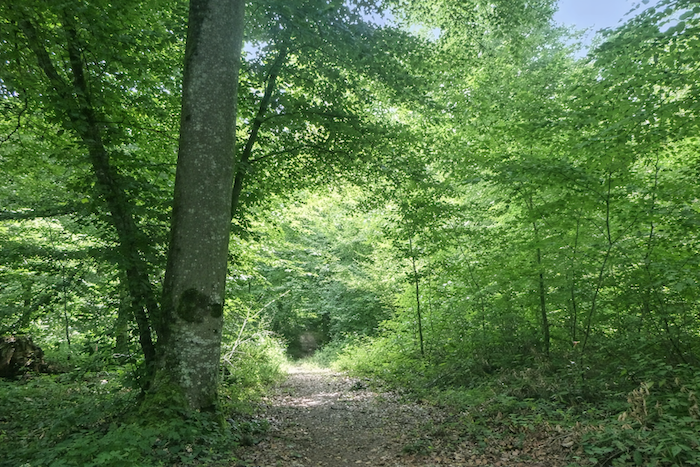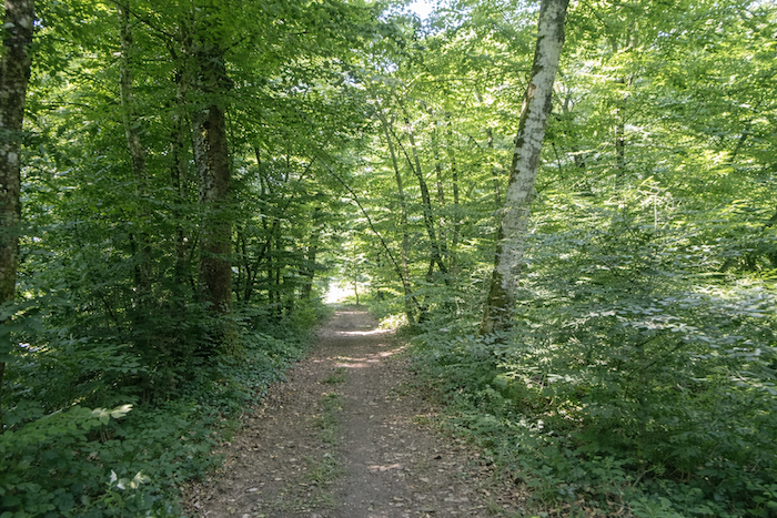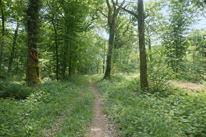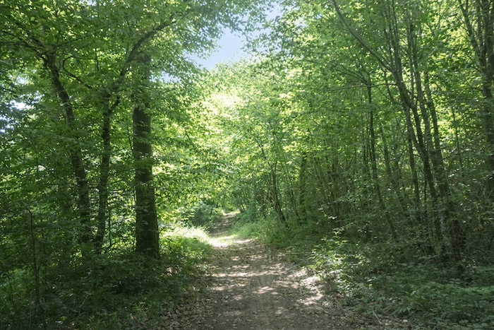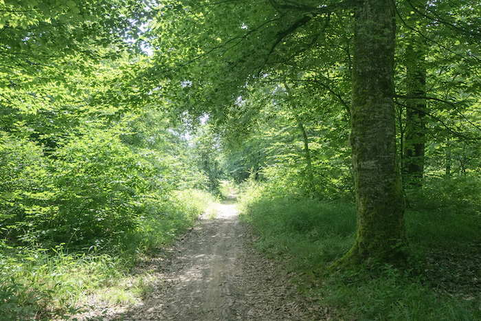 | Le chemin se fait ensuite caresse, ondulant avec douceur dans la forêt, au milieu des rejets de charmes et de hêtres qui tapissent le paysage. L’air y est plus dense, imprégné de sève et de fraîcheur, et l’œil se perd dans le vert profond de ce sanctuaire. |