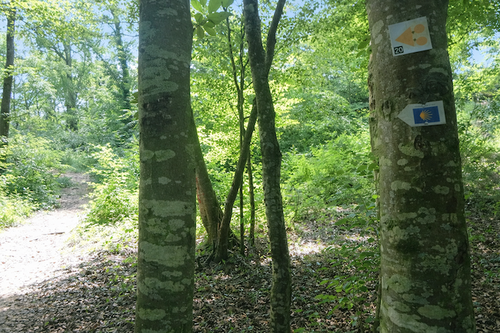 | Le chemin s’amincit encore, se faufilant entre les troncs comme un sentier joueur, virevoltant sous la voûte des arbres. Ici, les organisateurs du parcours ont choisi d’accrocher en abondance des coquilles aux écorces, comme une pluie de signes, alors même qu’aucune intersection ne trouble vraiment la marche. Elles sont parfois mal orientées, flottant dans le désordre, mais la flèche, fidèle, indique malgré tout la bonne direction. On se prend à sourire : quelle ironie de gaspiller ces précieux repères dans des lieux où l’on ne risque guère de s’égarer, alors qu’ils seraient tant nécessaires aux carrefours trompeurs. |
