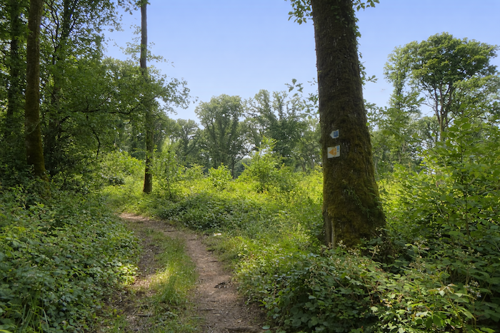 | Le chemin consent enfin à sortir de la forêt, et l’on doit le dire : pour bien des pèlerins, après près de huit kilomètres passés seuls dans ce grand bois, c’est une délivrance. Retrouver l’air libre, sentir le souffle du vent courir sans entraves et deviner au loin les contours d’un village, voilà qui rassure. L’on se dit alors, presque avec gratitude, que l’on n’a pas erré en vain, que le fil du chemin ne s’est pas rompu. |