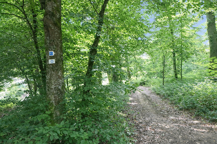 | Puis le chemin reprend, imperturbable, fidèle à sa descente presque imperceptible, toujours sous le couvert des feuillus. Les coquilles continuent de fleurir sur les troncs, ponctuant le passage comme des lanternes. Pas un conifère à l’horizon : le bois reste homogène, fidèle à son alliance avec les essences nobles de feuillus. |