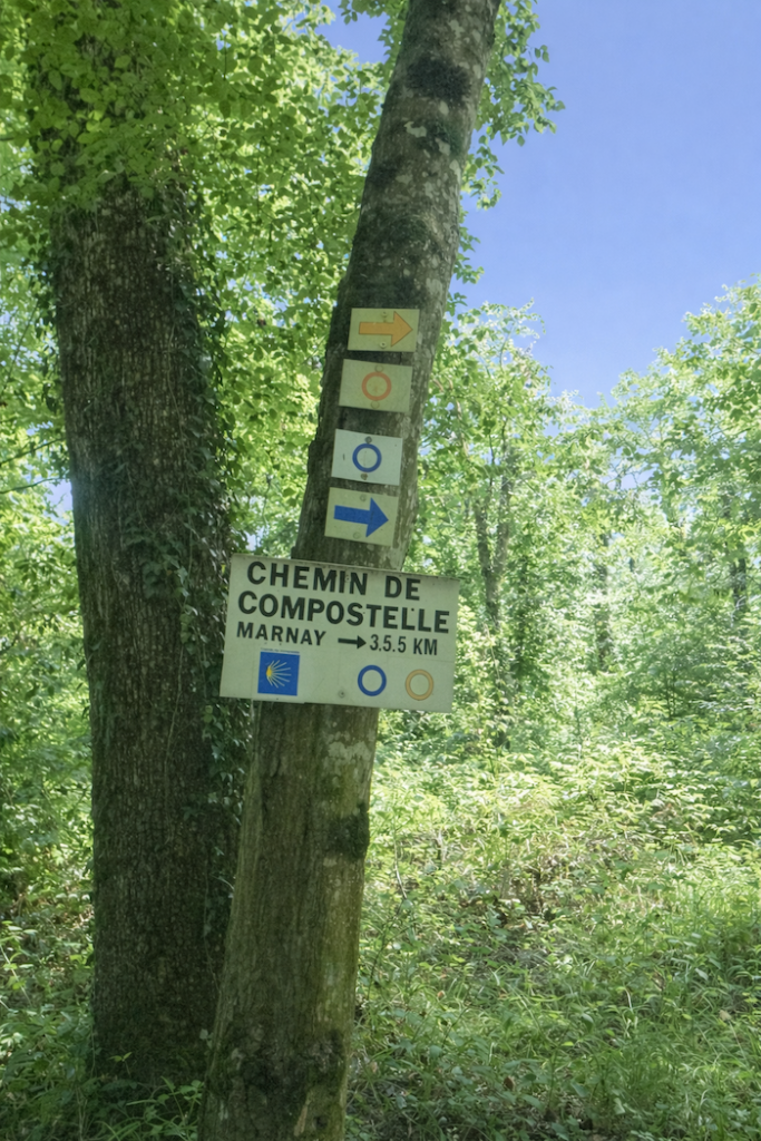 Plus loin, un panneau surgit : il annonce que vous êtes à 3,5 kilomètres de Marnay. Déjà près de six kilomètres ont été avalés à travers ce bois sans jamais se perdre, preuve que l’abondance de coquilles trouve peut-être une justification. D’autres chemins traversent également ces lieux, signalés par des ronds, des triangles et des couleurs diverses, comme si chaque balisage cherchait à imposer sa voix dans cette polyphonie forestière.