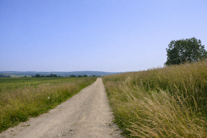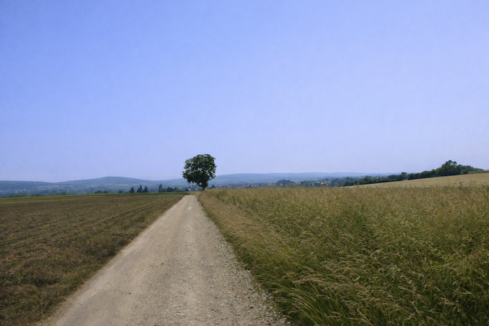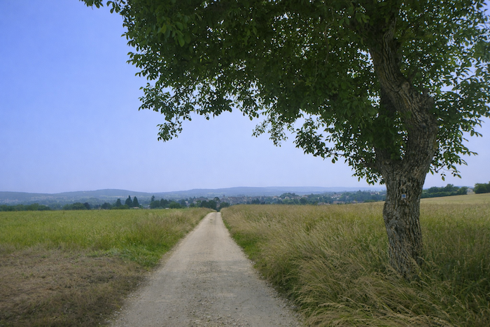 | Très vite, vous quittez le goudron. Sous vos pas s’ouvre une large route de terre battue, souple et accueillante. Elle serpente avec douceur sur la colline, accompagnant les courbes du relief comme si elle voulait ménager le pèlerin. Le voyage s’accorde enfin à la respiration profonde de la terre. |
