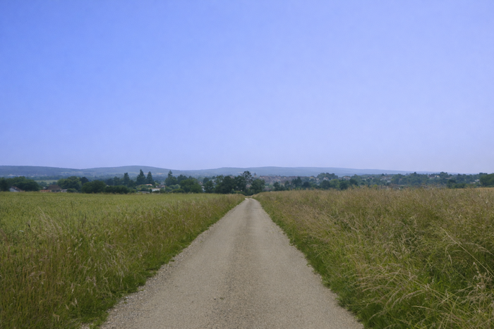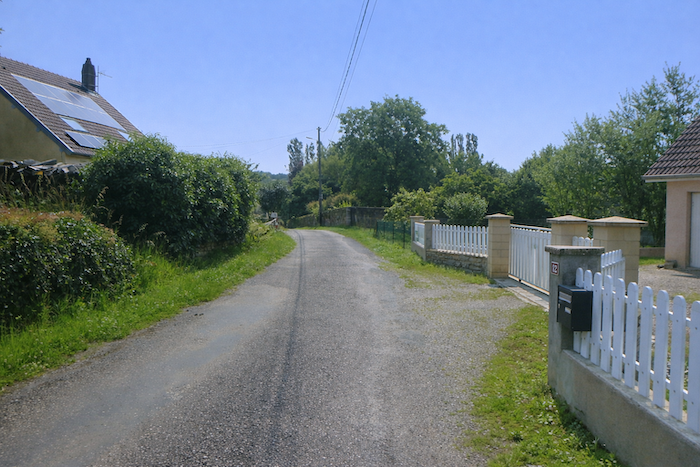 | Vous marchez ici à plat, sur le Chemin de Bellevue, longeant les dernières maisons du bourg. Ces demeures semblent comme les ultimes témoins d’un monde habité avant que la campagne ne reprenne ses droits. L’air s’y allège, et déjà l’horizon commence à s’ouvrir, promesse des hauteurs à venir. |